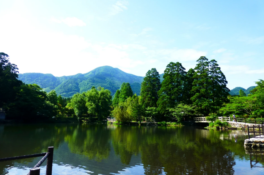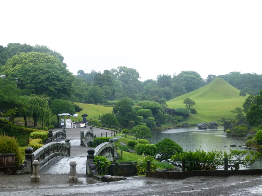水前寺成趣園は、3代目熊本藩主綱利公の時代に完成されたそうで、池を中心とした海遊式の庭園です。借景で富士があるのも特徴的ですね。成趣園に限らず、借景のあるお庭で富士山を用いる所は多くございます。日本人にとって憧れの象徴なのだな…という事を思わされますね。」