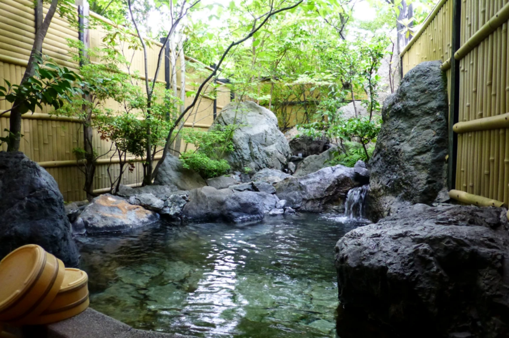 そのような条件の元、まるで森の奥へと続くかのような仕上がり…見事の一言に尽きます。また、こちらのお庭露天風呂と池が繋がっているらしく、その一体感も個性的でユニークだと代表は語ります。