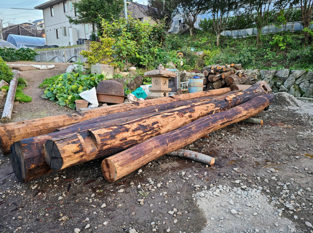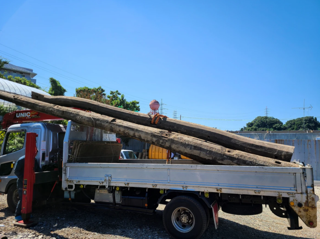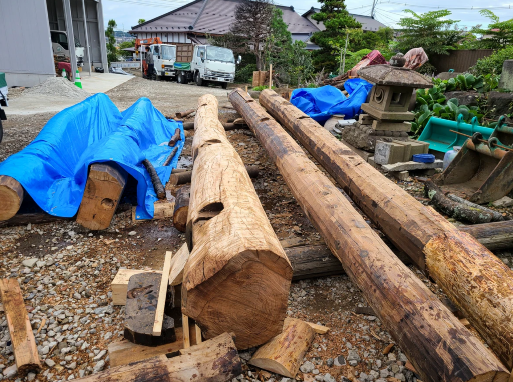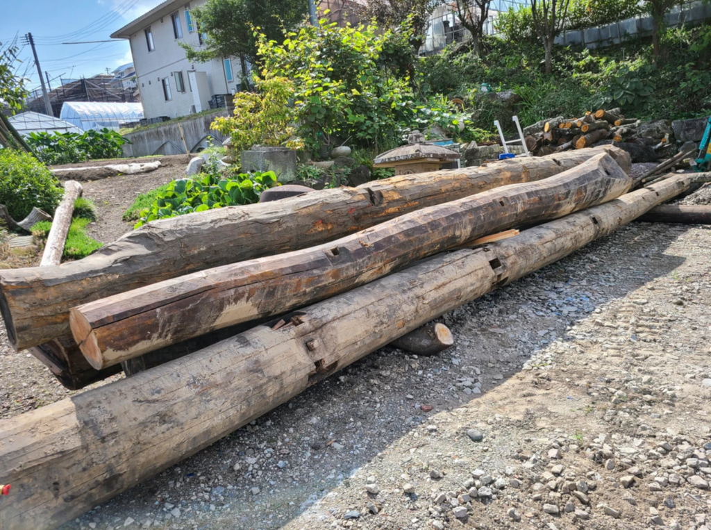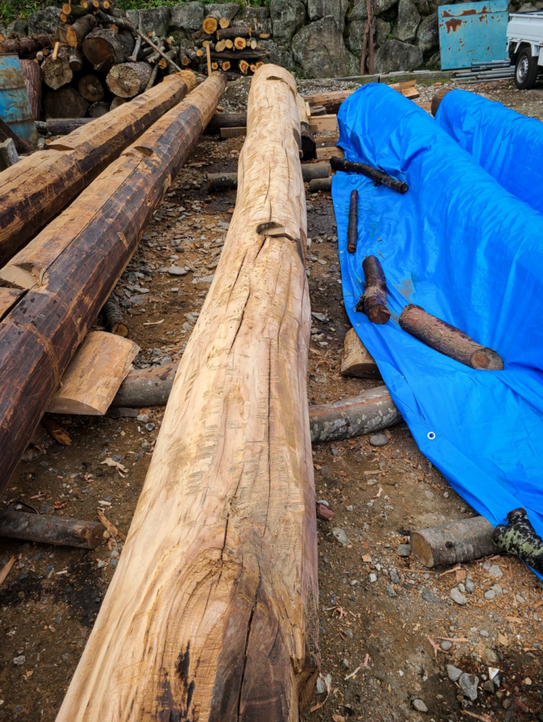 「7m60cm・7m20cm、直径40cm、重さ約700kgのケヤキとスギが3本に加え、5m少々あるケヤキが2本ございました。このクラスの材木はそうそうお目にかかれるかどうか…中古ですから、人によっては汚かったり見窄らしいと感じる方もおられるかもしれません。ですが、これらは間違いなく‘本物’であると感じました。
