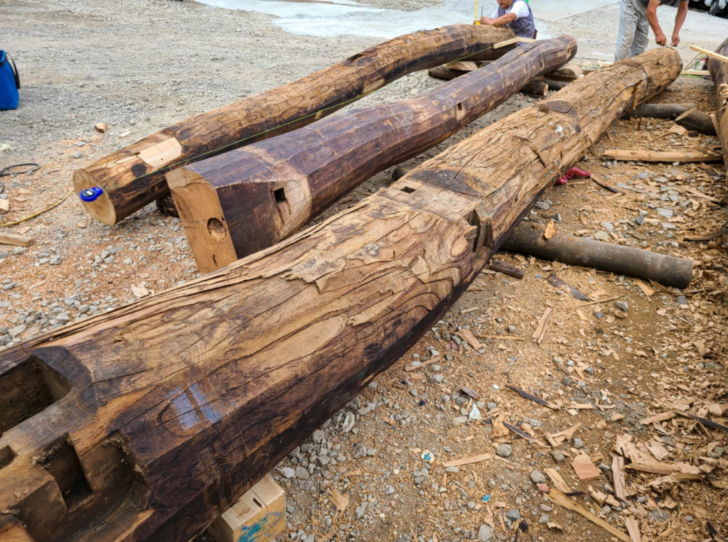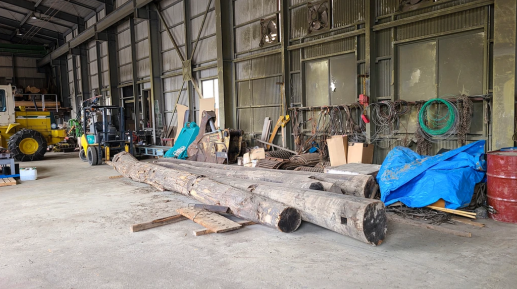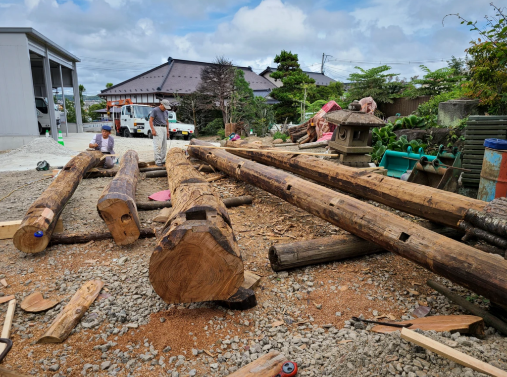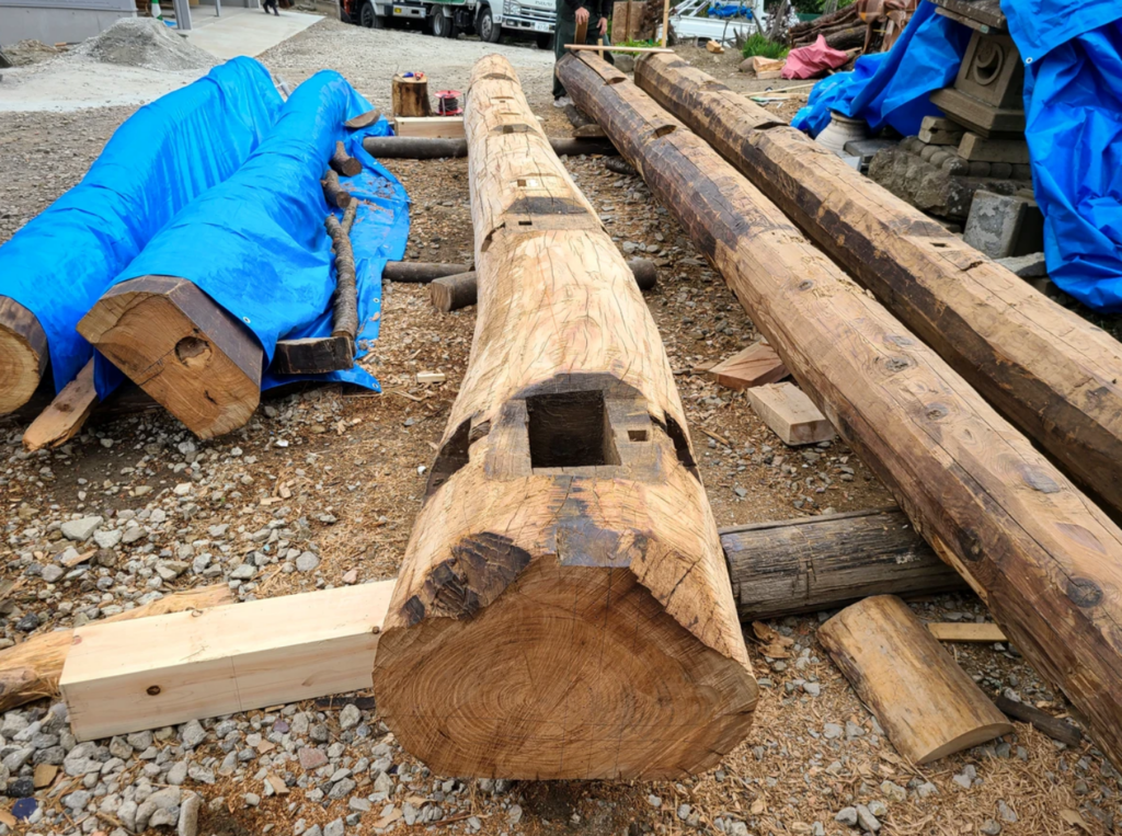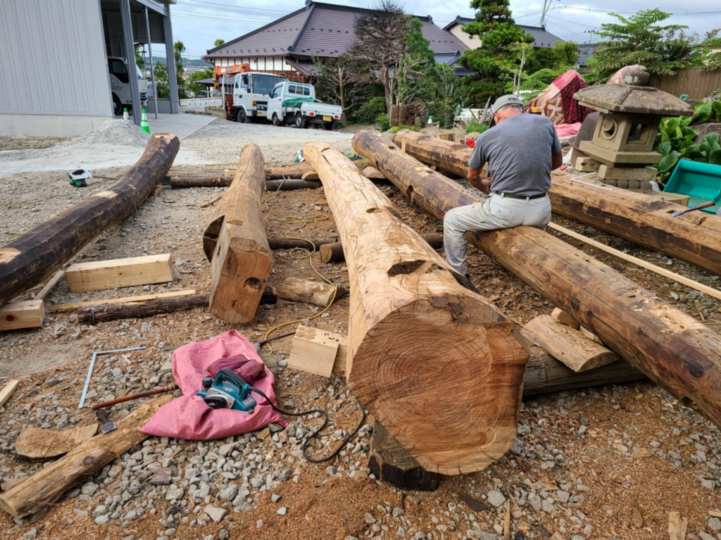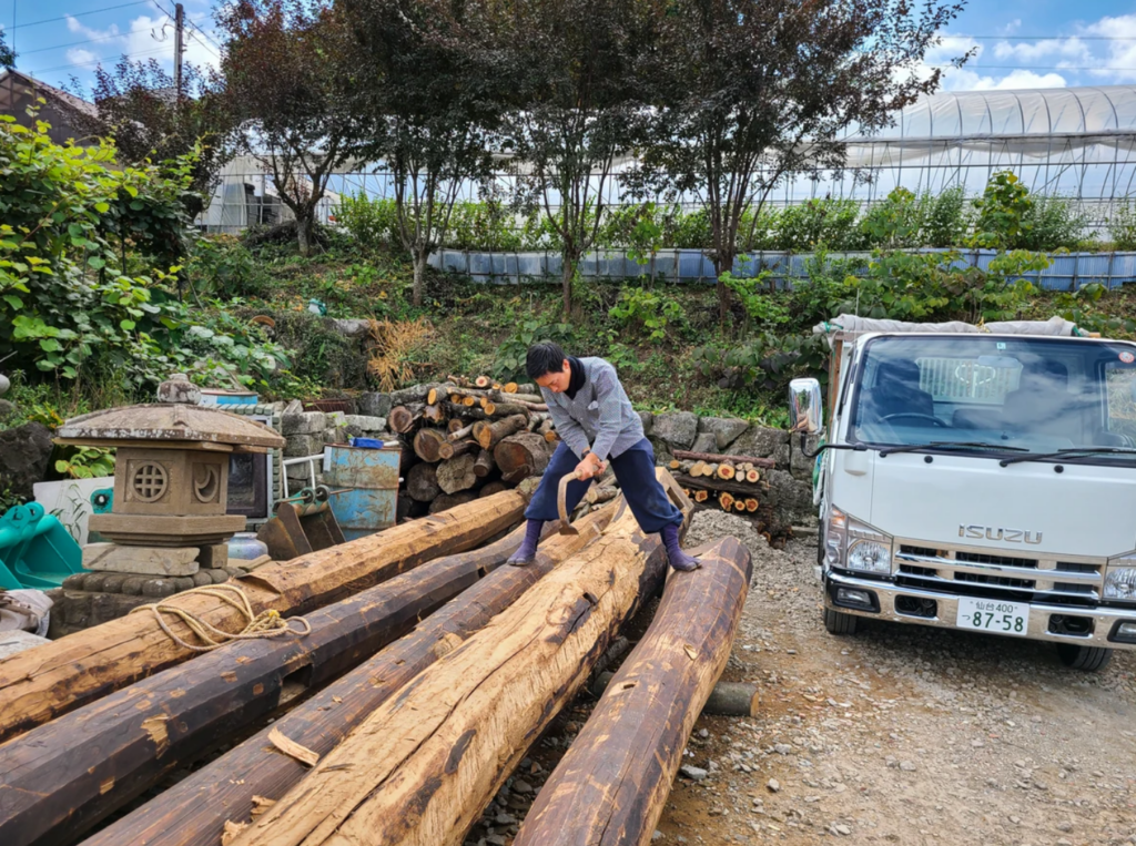「7m60cm・7m20cm、直径40cm、重さ約700kgのケヤキとスギが3本に加え、5m少々あるケヤキが2本ございました。このクラスの材木はそうそうお目にかかれるかどうか…中古ですから、人によっては汚かったり見窄らしいと感じる方もおられるかもしれません。ですが、これらは間違いなく‘本物’であると感じました。