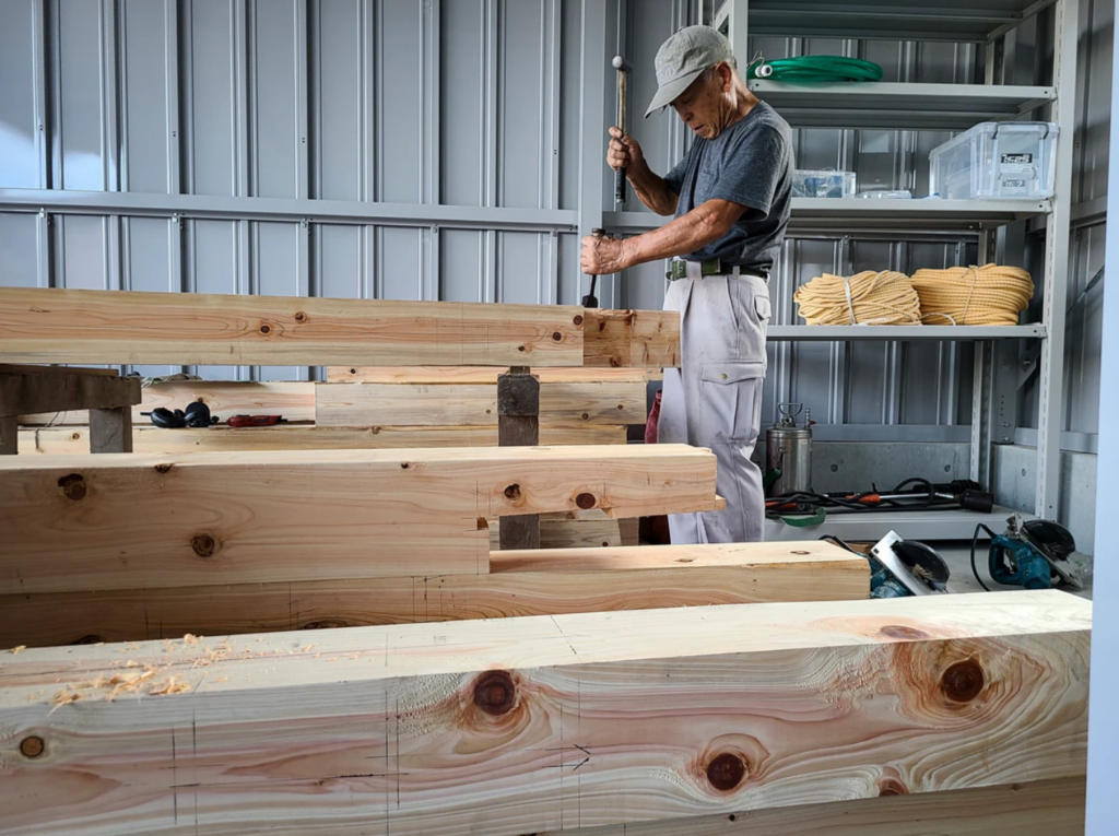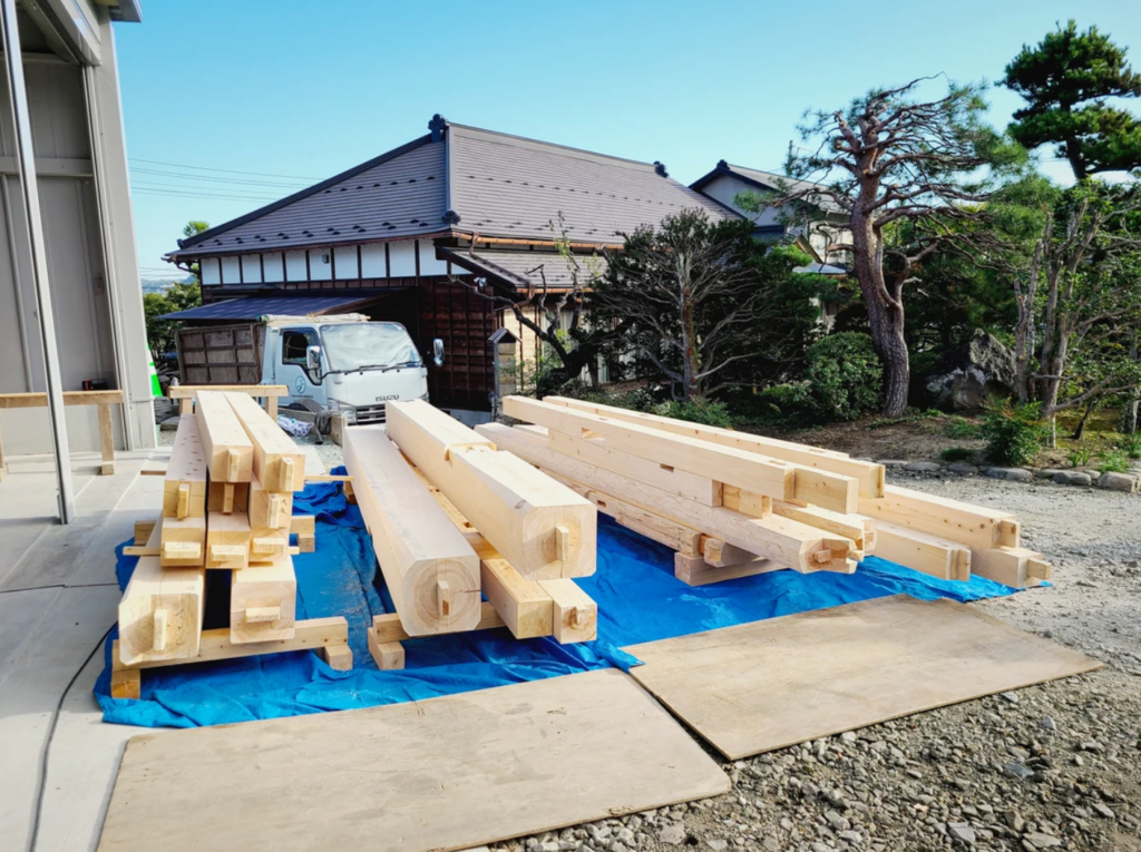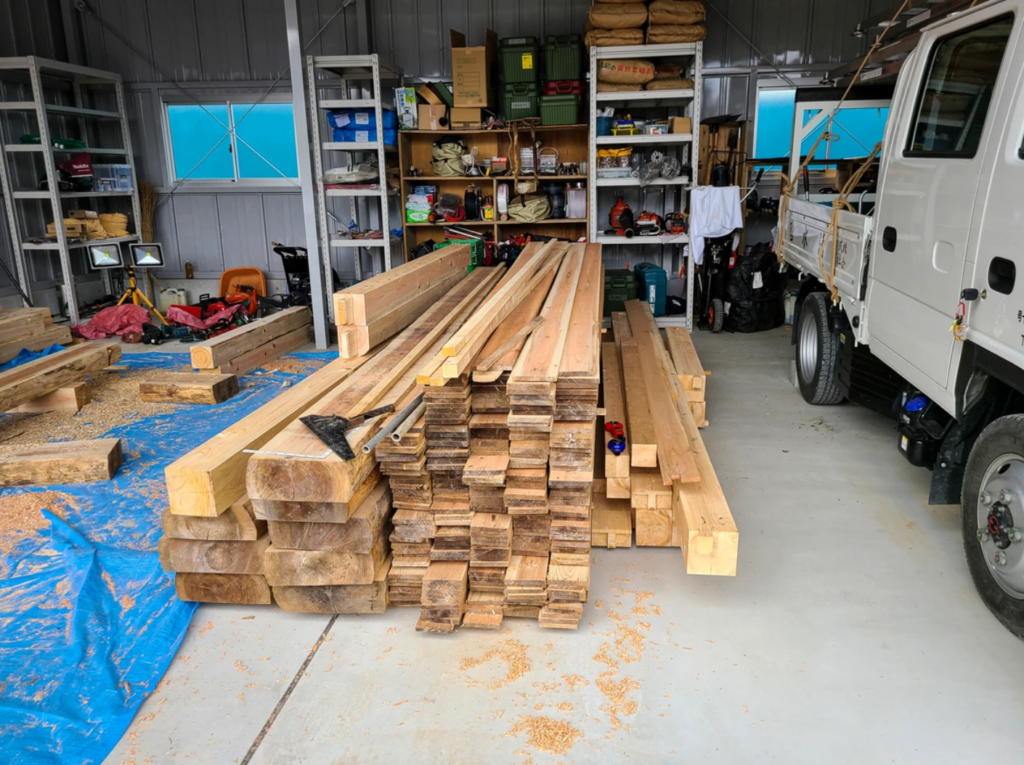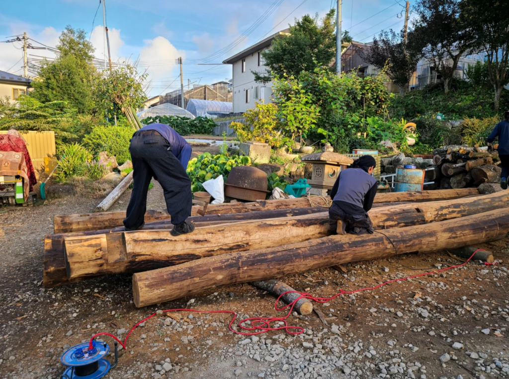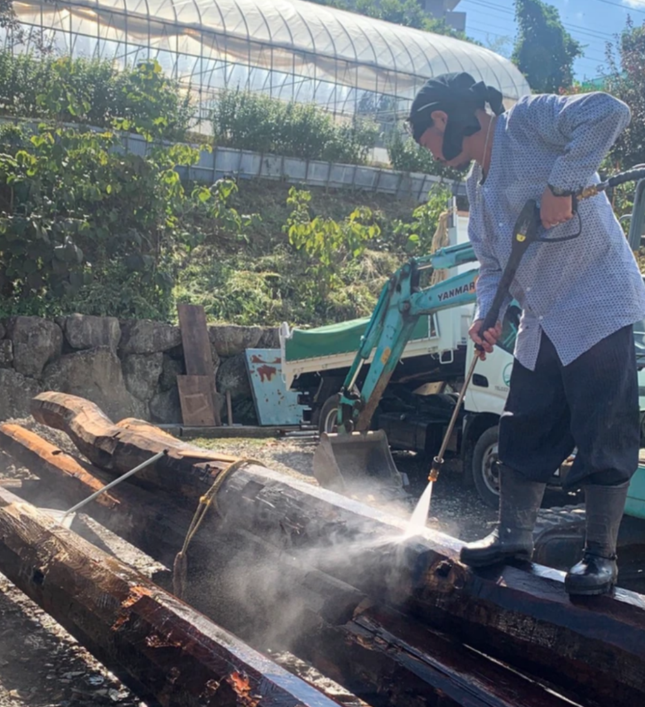 「元々材木が使用されていた古民家はいわゆる茅葺き屋根で火を焚く環境だった為、材木も納品された当初は煤けて泥もつき汚れている状態でした。ここからは、材料として使用出来る状態にする為、高圧洗浄機で洗ったり表面を削っていったり…という作業を行って参ります。」