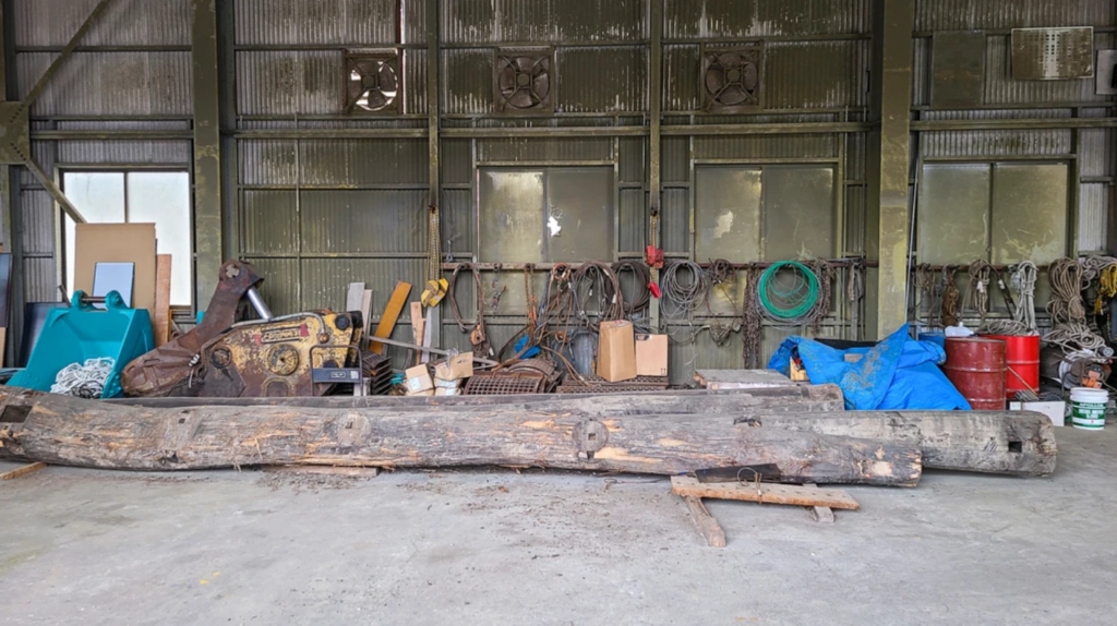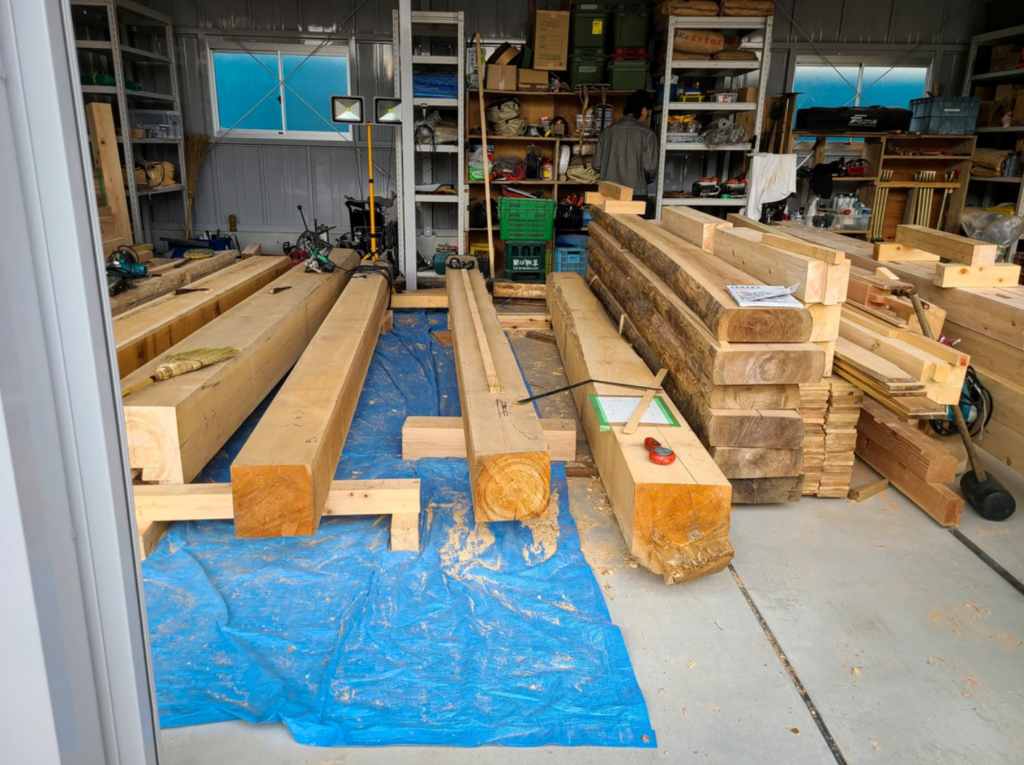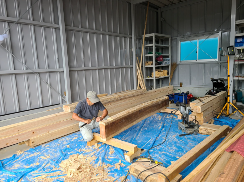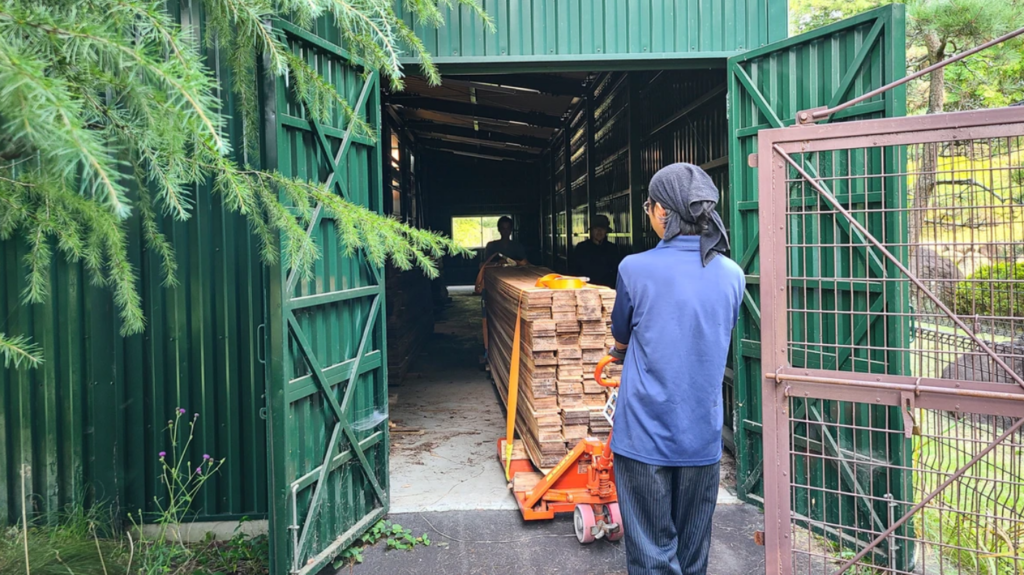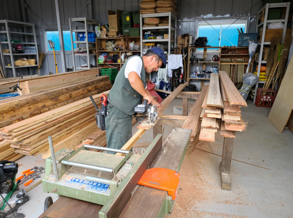 「元々材木が使用されていた古民家はいわゆる茅葺き屋根で火を焚く環境だった為、材木も納品された当初は煤けて泥もつき汚れている状態でした。ここからは、材料として使用出来る状態にする為、高圧洗浄機で洗ったり表面を削っていったり…という作業を行って参ります。」