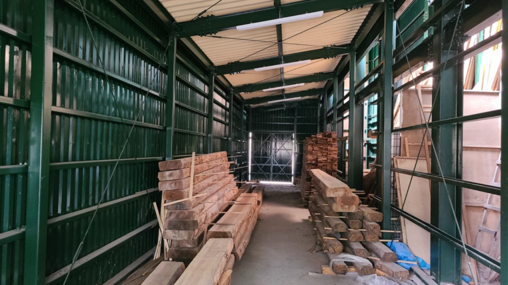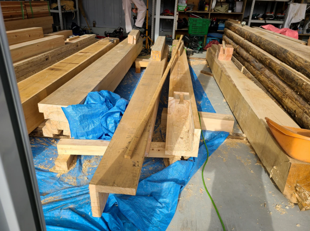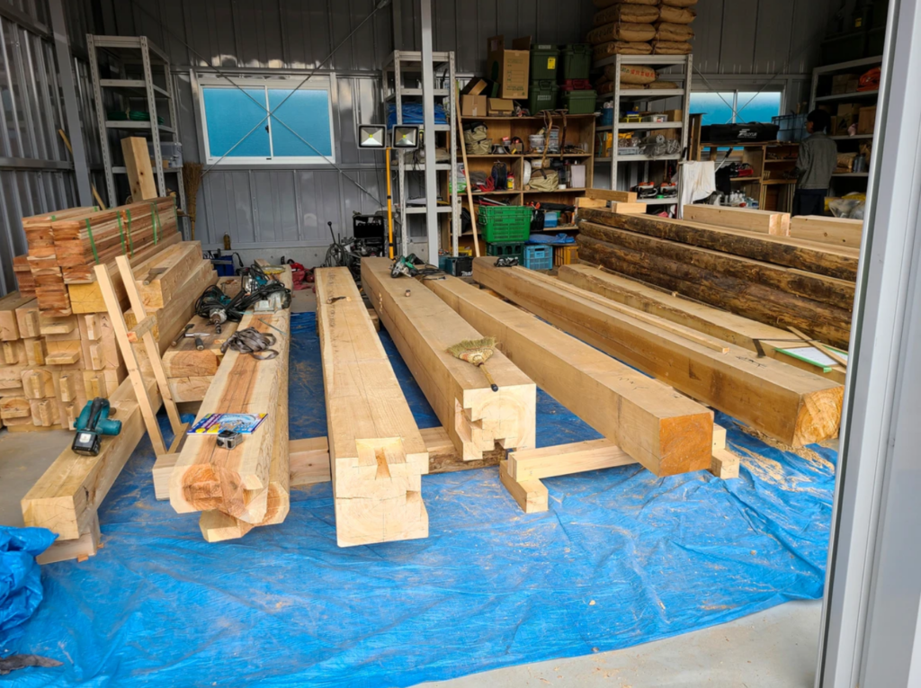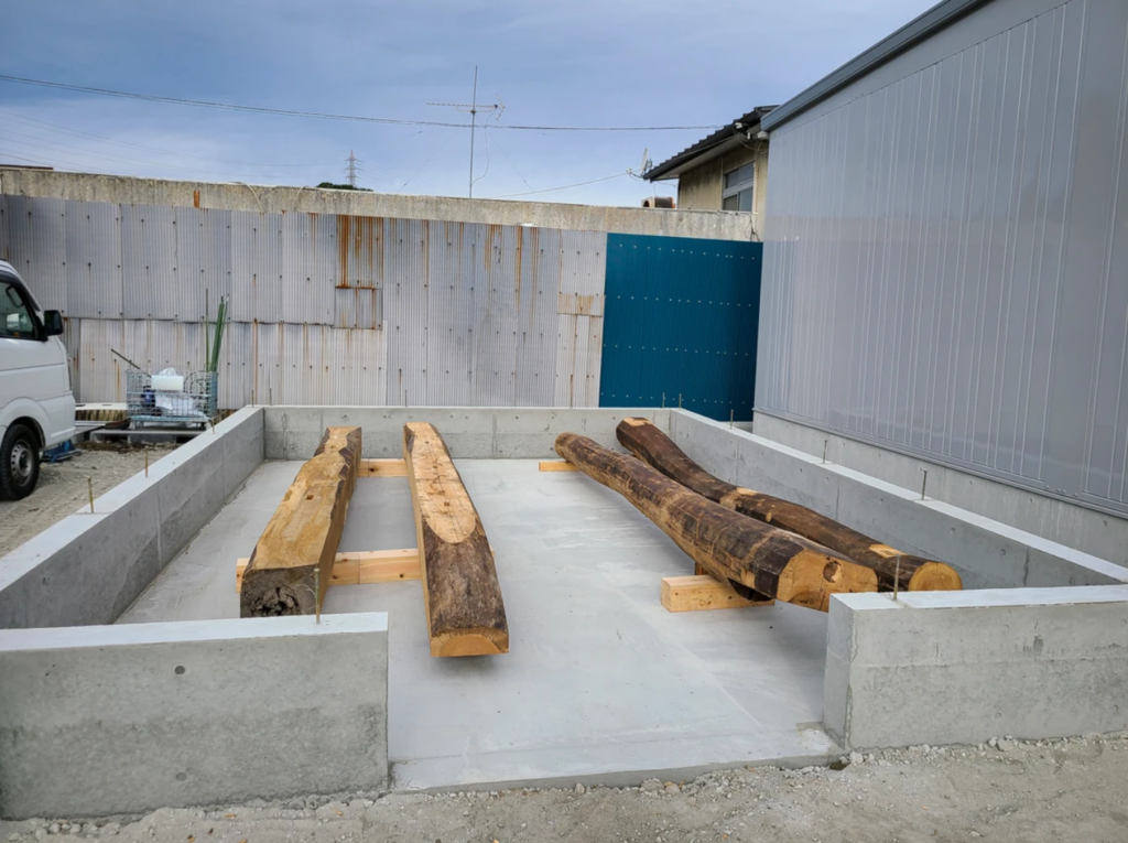 「短く切ることなくこの材木をそのまま使いたい…という想いが強く、建物でもそのまま使うことが出来るよう図面をひきました。そこからは、現在の建築法に基づいて実現可能な方法へとすり合わせるのに時間を要しましたが…なんとか材料として使うことの出来る段階まで漕ぎ着ける事ができた次第です。」