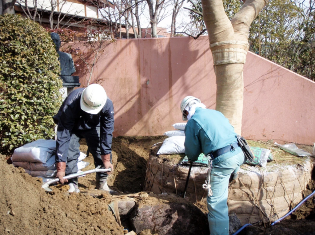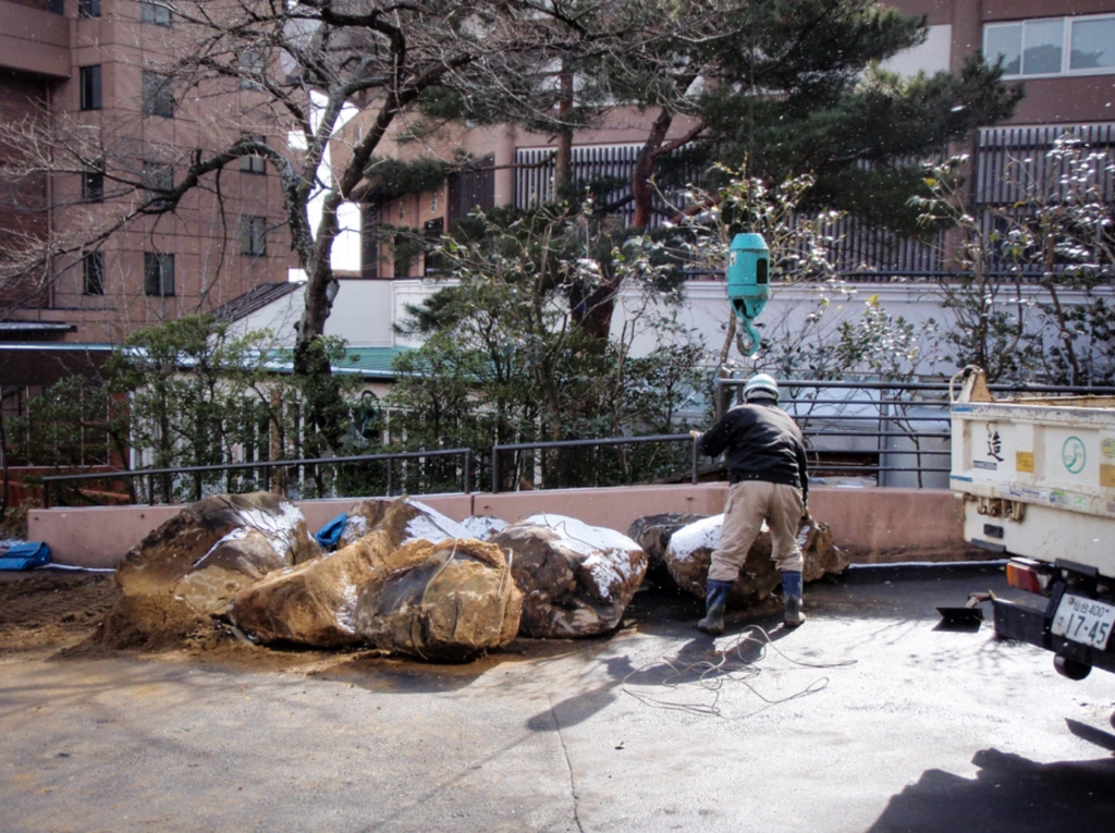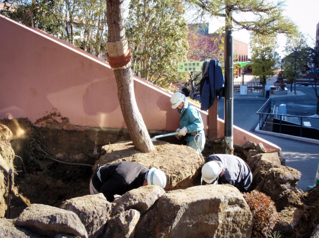 根巻するにあたり一部石を外し 掘り取った後に戻します。