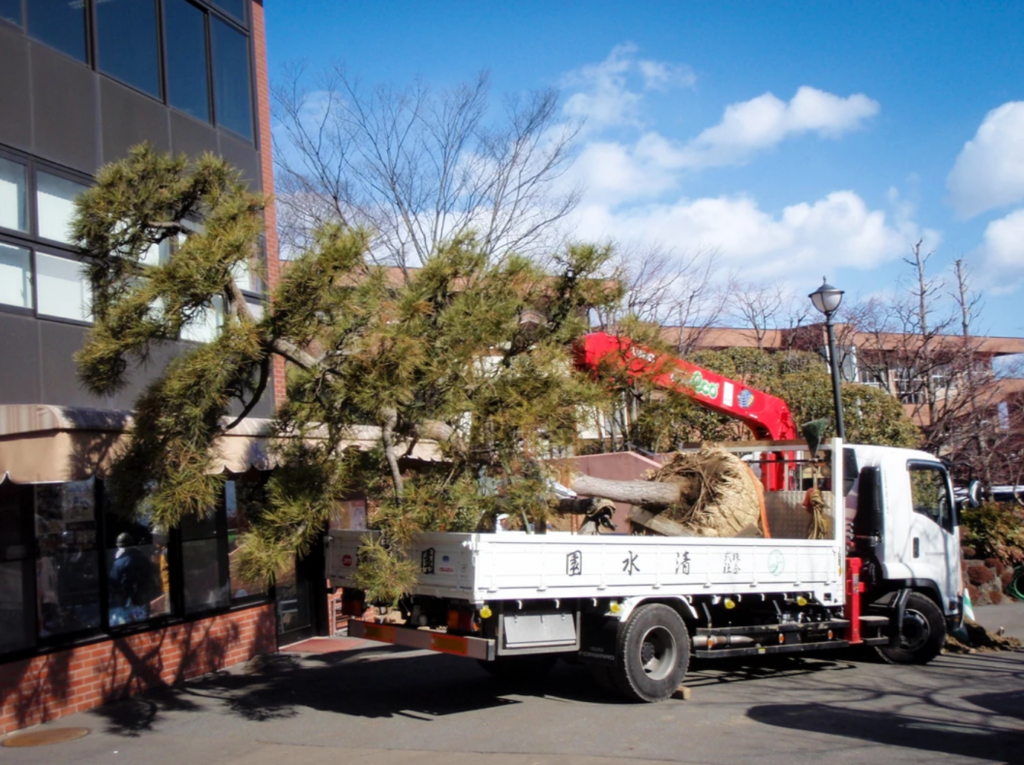 モミジを移植するにあたり 松や低木を移植し校外に搬出します。