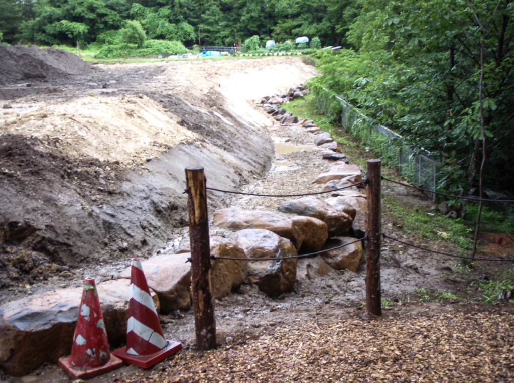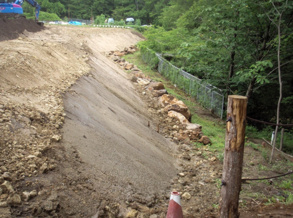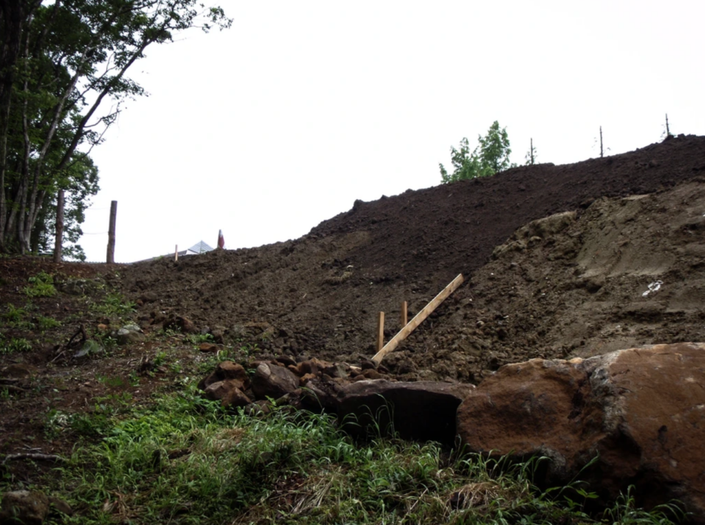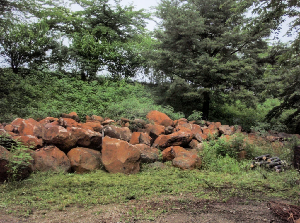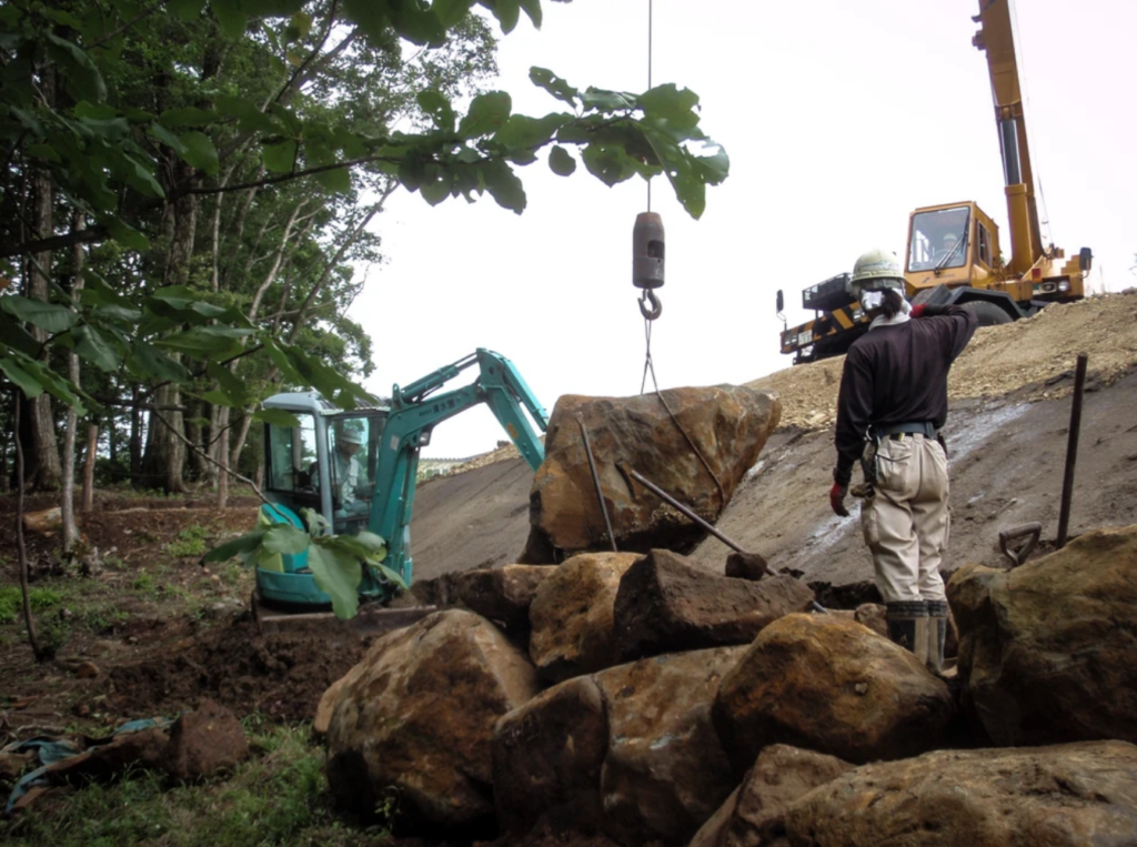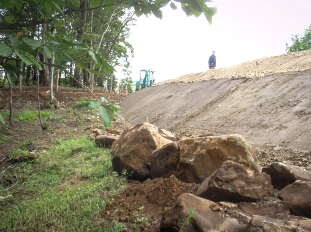今回お話し致しますのは、必然的にやることになった石積み……当初はやる予定がなかったものの、急遽‘やらざるを得ない’状況になり対応した、という現場です。平成24年頃手がけた現場ですが、山に土を盛っていた現場で元々法面を作る前に‘石が並んで置いていただけ’の状態でした。畑を造られるご予定で、施行中水が溜まらないようにする(排水)計画を行う前に、運悪く台風が来てしまい…あちらこちらから水が流れてきて崩れてしまったという次第です。