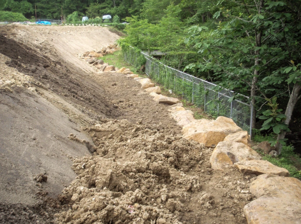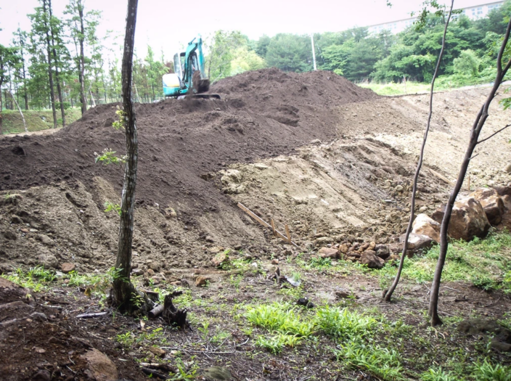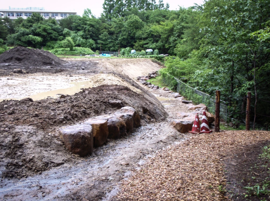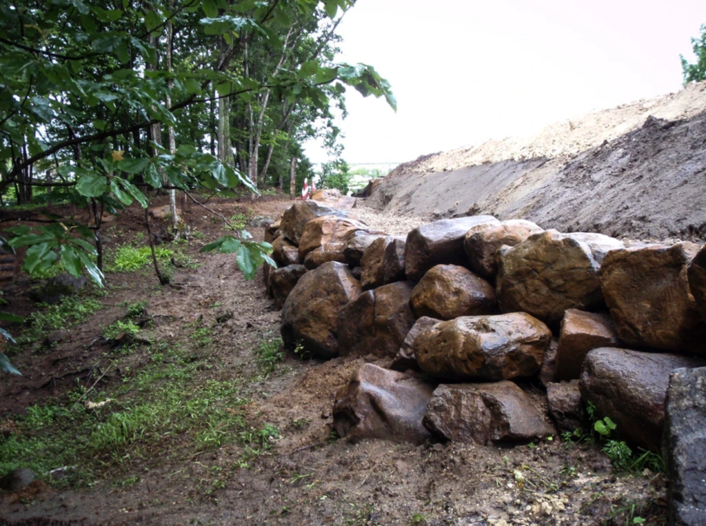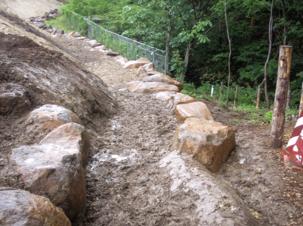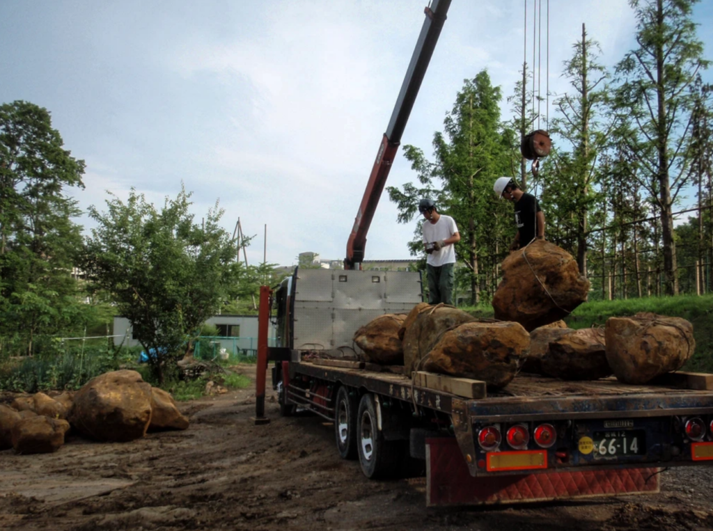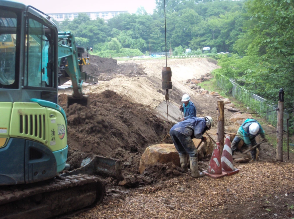 今回お話し致しますのは、必然的にやることになった石積み……当初はやる予定がなかったものの、急遽‘やらざるを得ない’状況になり対応した、という現場です。平成24年頃手がけた現場ですが、山に土を盛っていた現場で元々法面を作る前に‘石が並んで置いていただけ’の状態でした。畑を造られるご予定で、施行中水が溜まらないようにする(排水)計画を行う前に、運悪く台風が来てしまい…あちらこちらから水が流れてきて崩れてしまったという次第です。