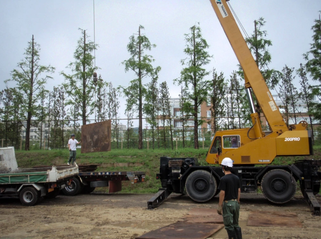 鉄板も900kgありますが、大型クレーンでは遠くまで敷き並べられます。