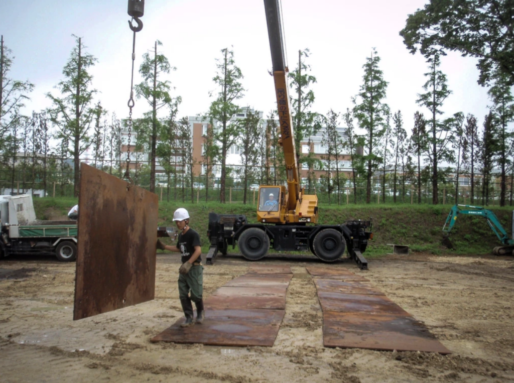 大型トラックを走行するため鉄板養生をし現場内まで入っていきます。