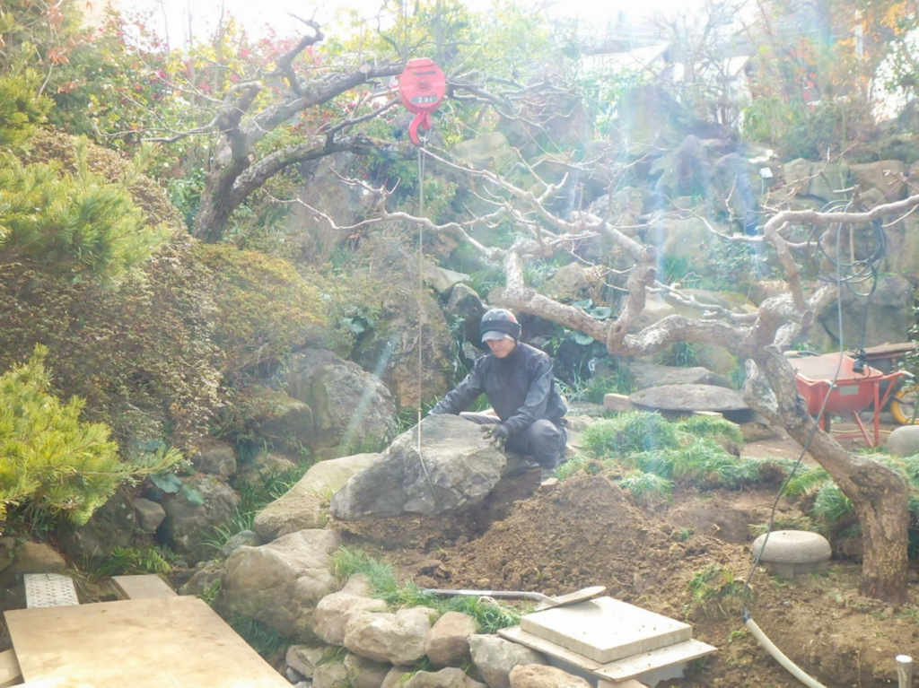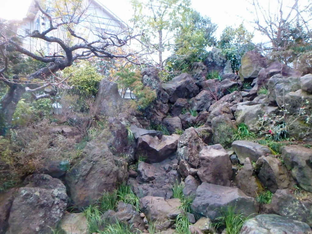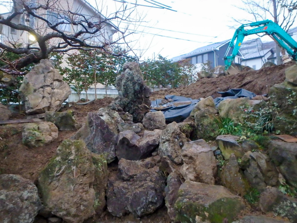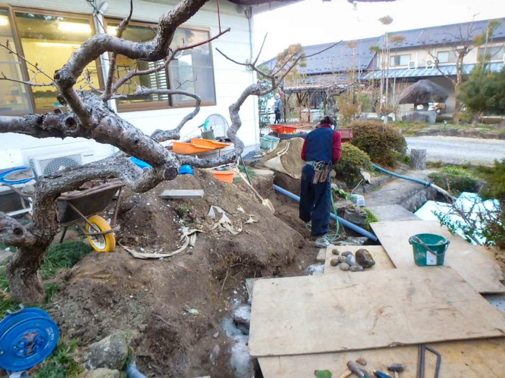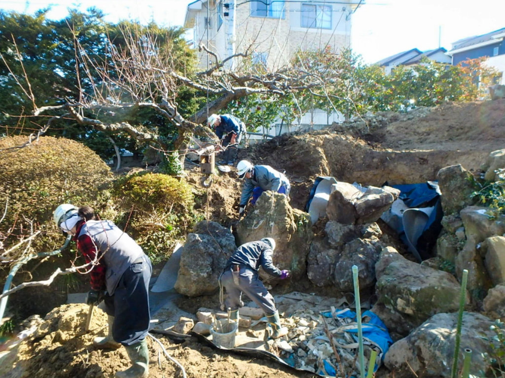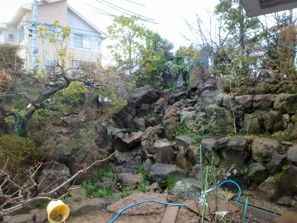 弊社代表が10年計画で実施している‘敷地の全面改修’法面滝石積み3期工事でございます。前回2期工事でお話ししていた濾過槽も配置を変えたいと思っておりましたので、併せて一新することに致しました。法面だったところも全て石積みにしたおかげで、コンクリートだった部分も荘厳な印象に仕上がっています。