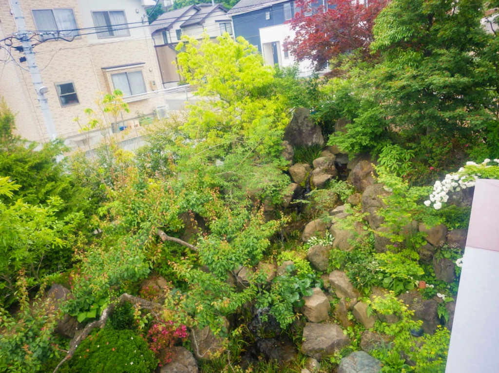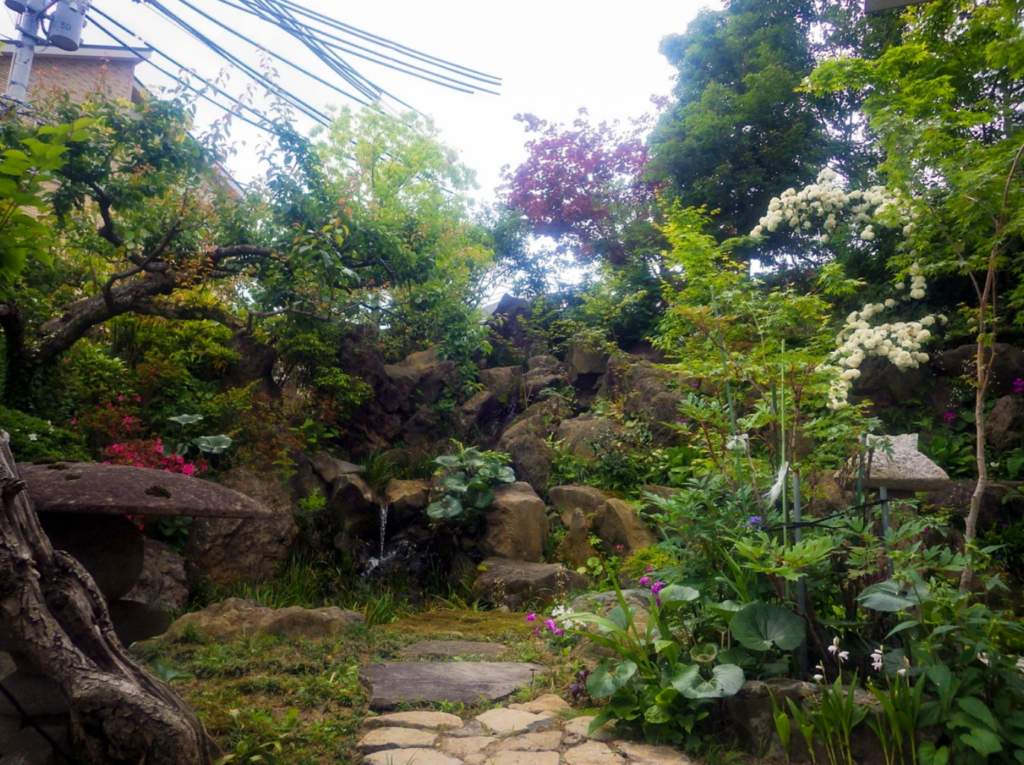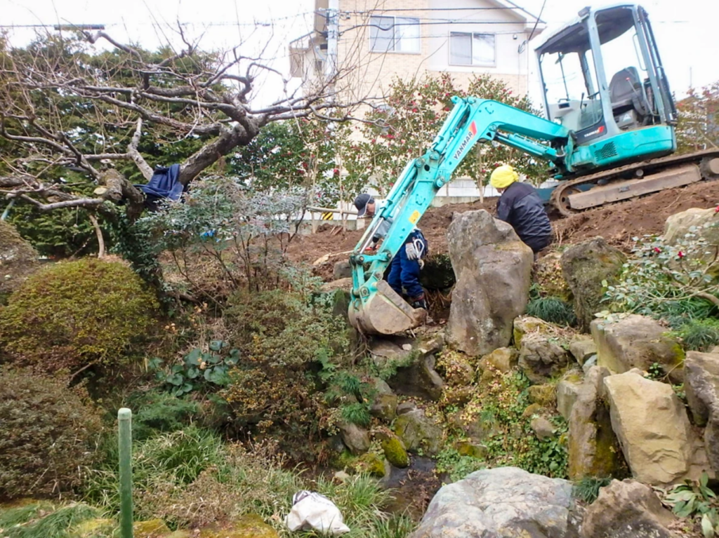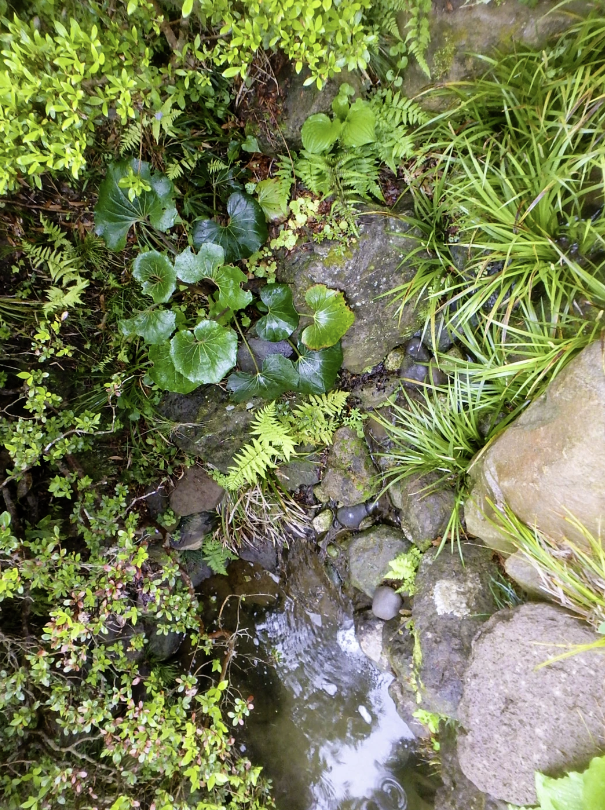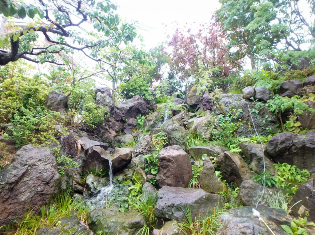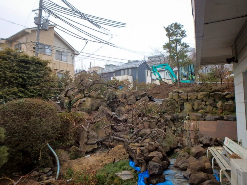 弊社代表が10年計画で実施している‘敷地の全面改修’法面滝石積み3期工事でございます。前回2期工事でお話ししていた濾過槽も配置を変えたいと思っておりましたので、併せて一新することに致しました。法面だったところも全て石積みにしたおかげで、コンクリートだった部分も荘厳な印象に仕上がっています。