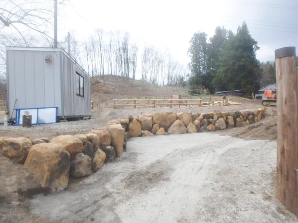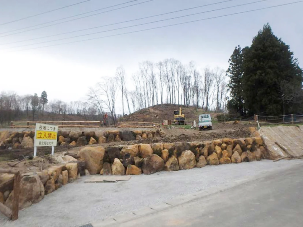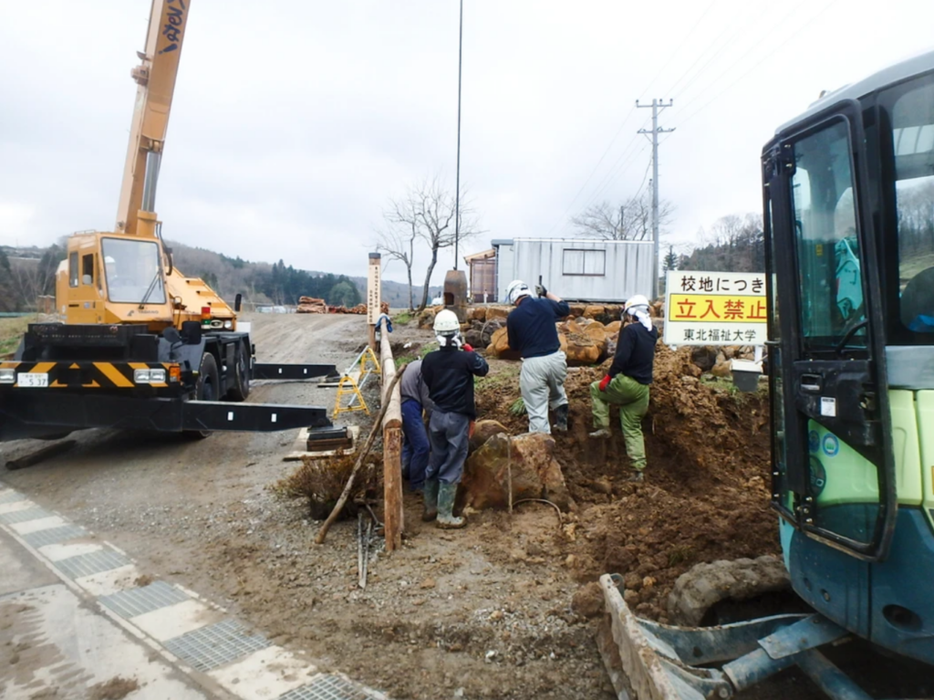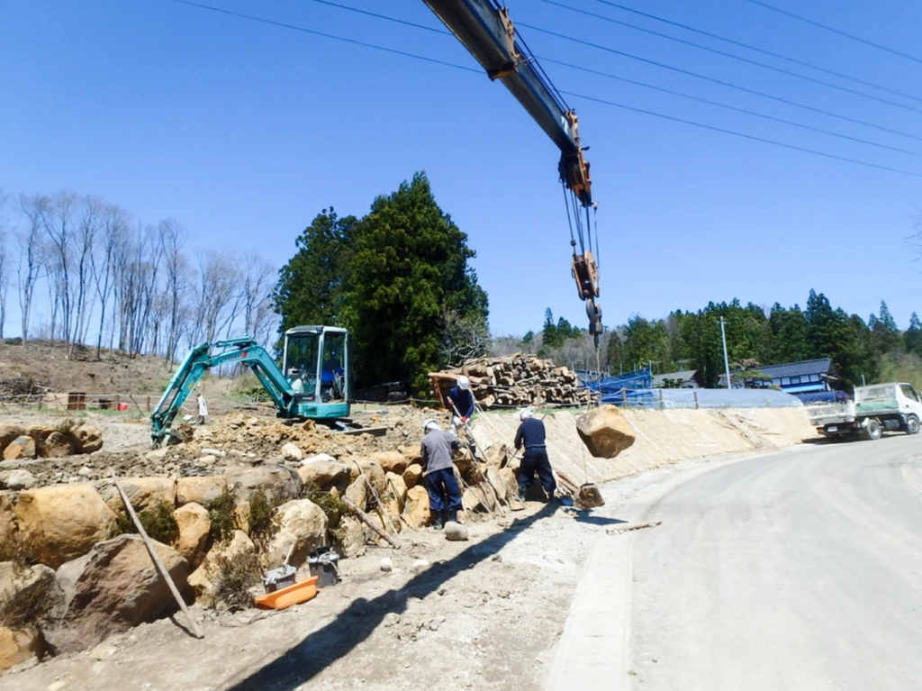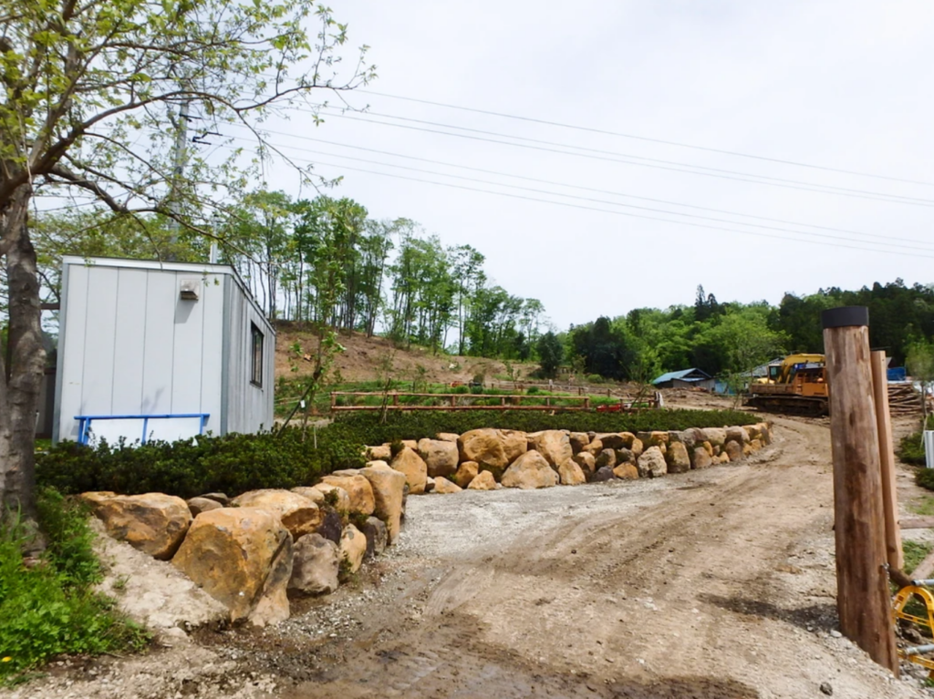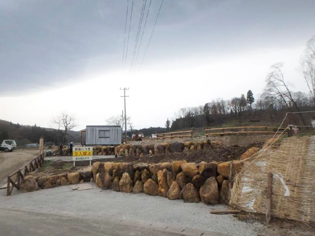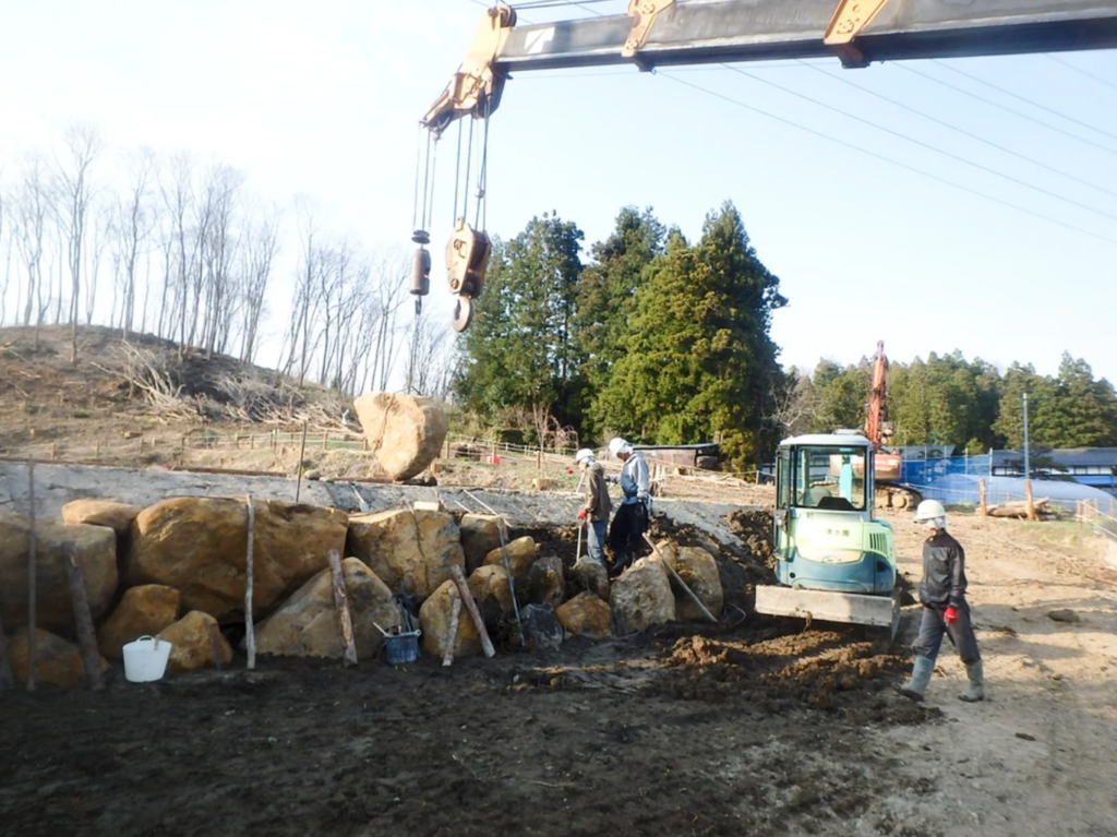 弊社が平成28年に手がけた「大きな石を使った石積み」の現場、朴木山(ほおのきやま)にございます、東北福祉大・西田中キャンパスでの石積みです。総計で約40mと非常に長い石積みとなりました。石積みは2段に分かれており、中央の通路を挟むような形で両側に石積みがあるような設計だそう。水捌けの悪い現場だったようで、排水に関しても随分苦労されたとの事でした。