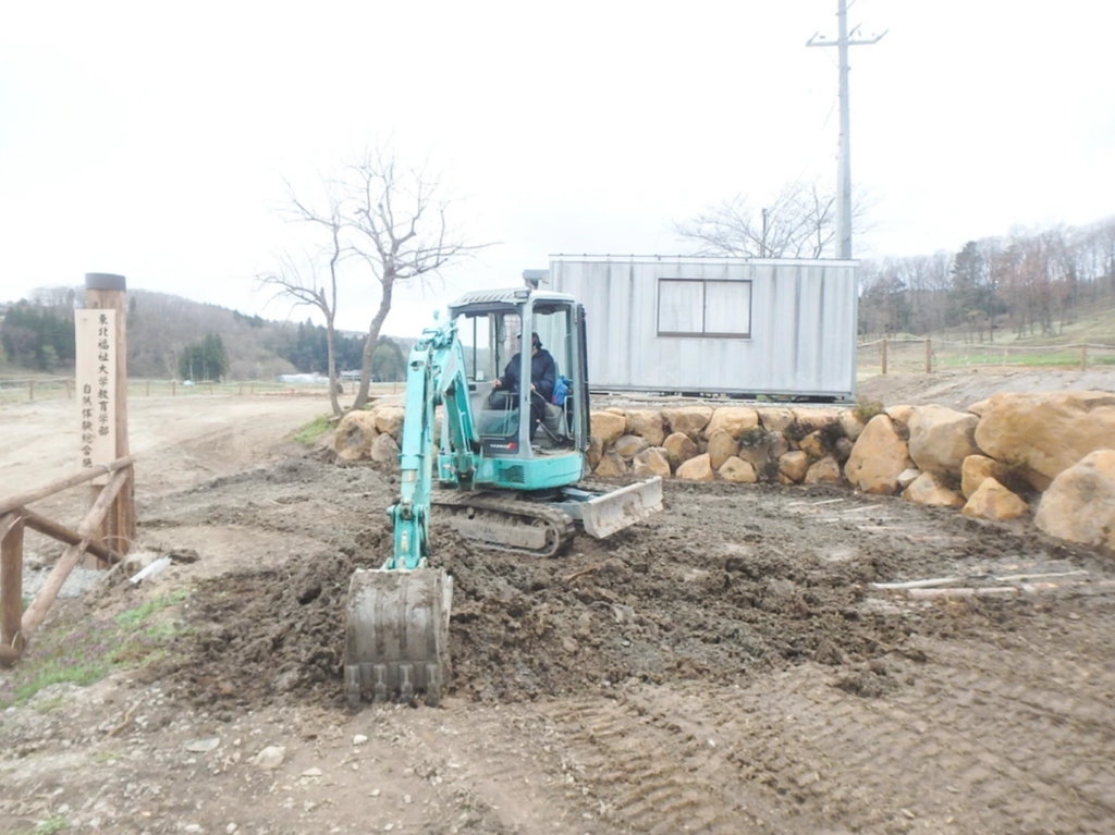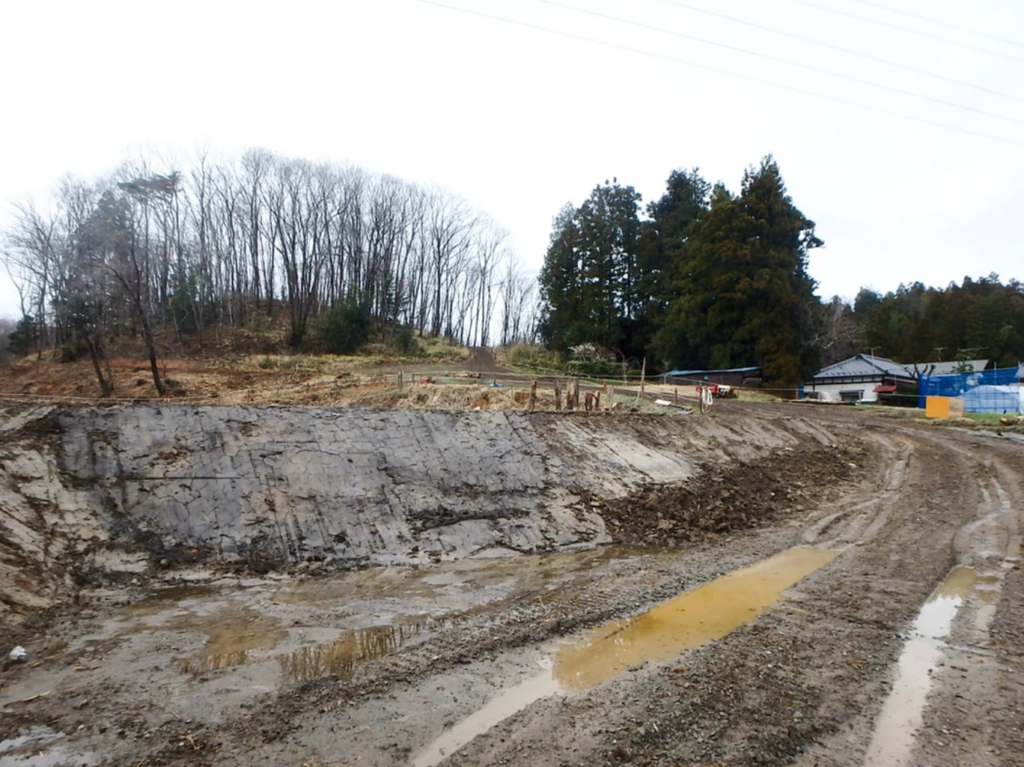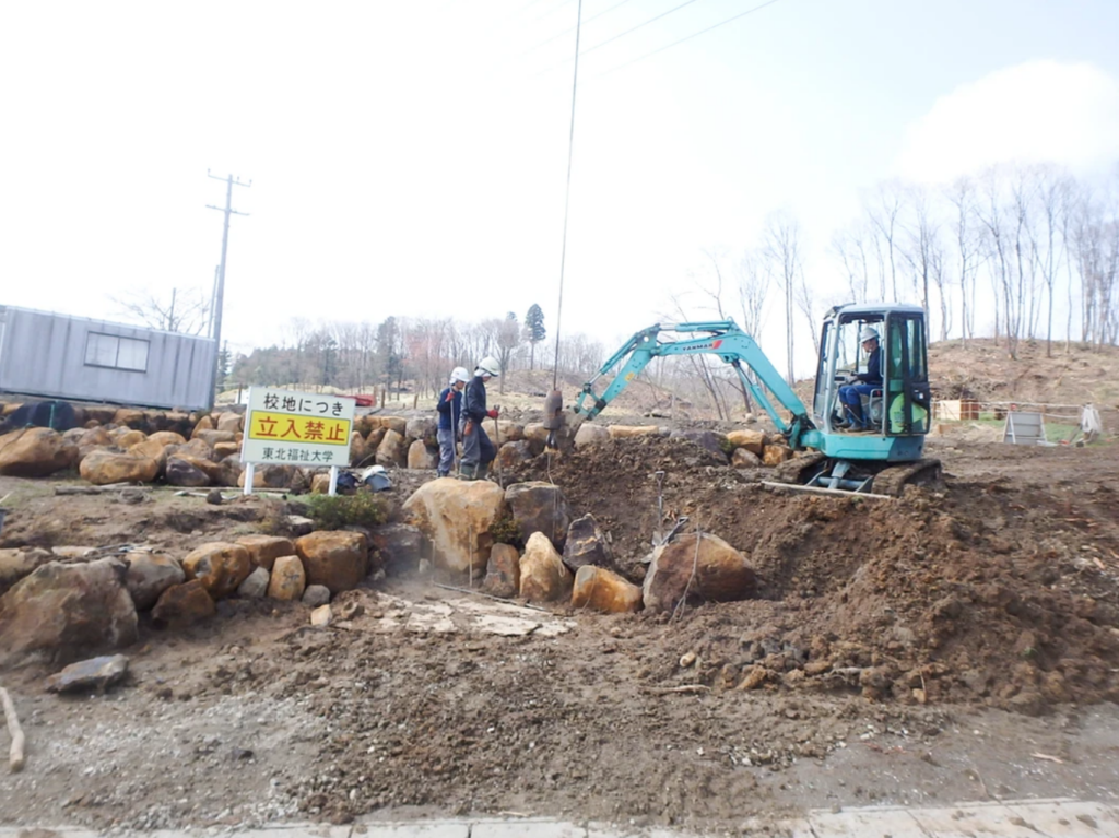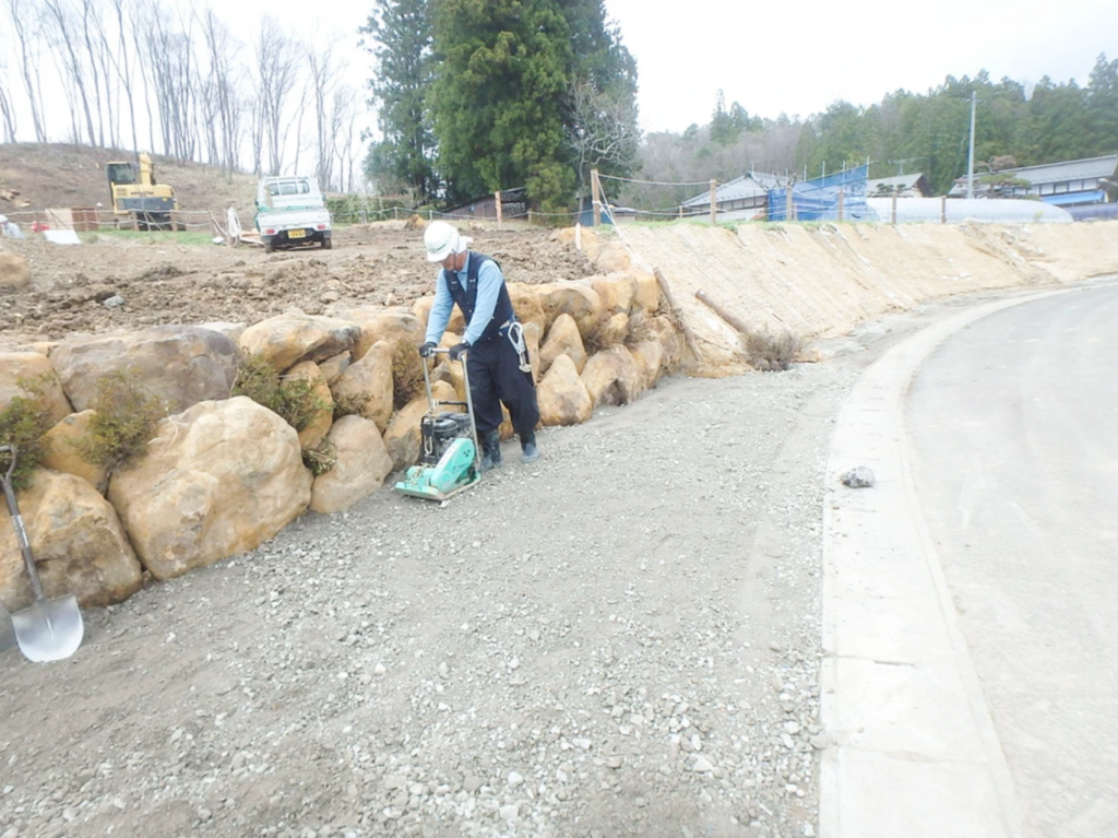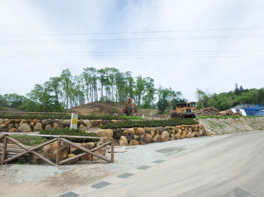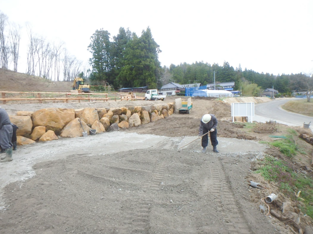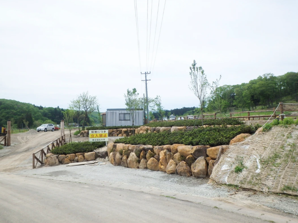 弊社が平成28年に手がけた「大きな石を使った石積み」の現場、朴木山(ほおのきやま)にございます、東北福祉大・西田中キャンパスでの石積みです。総計で約40mと非常に長い石積みとなりました。石積みは2段に分かれており、中央の通路を挟むような形で両側に石積みがあるような設計だそう。水捌けの悪い現場だったようで、排水に関しても随分苦労されたとの事でした。