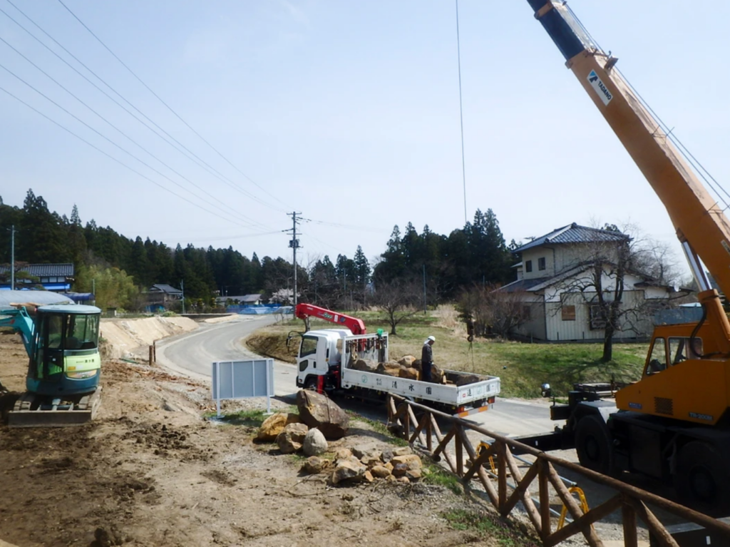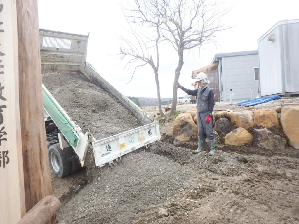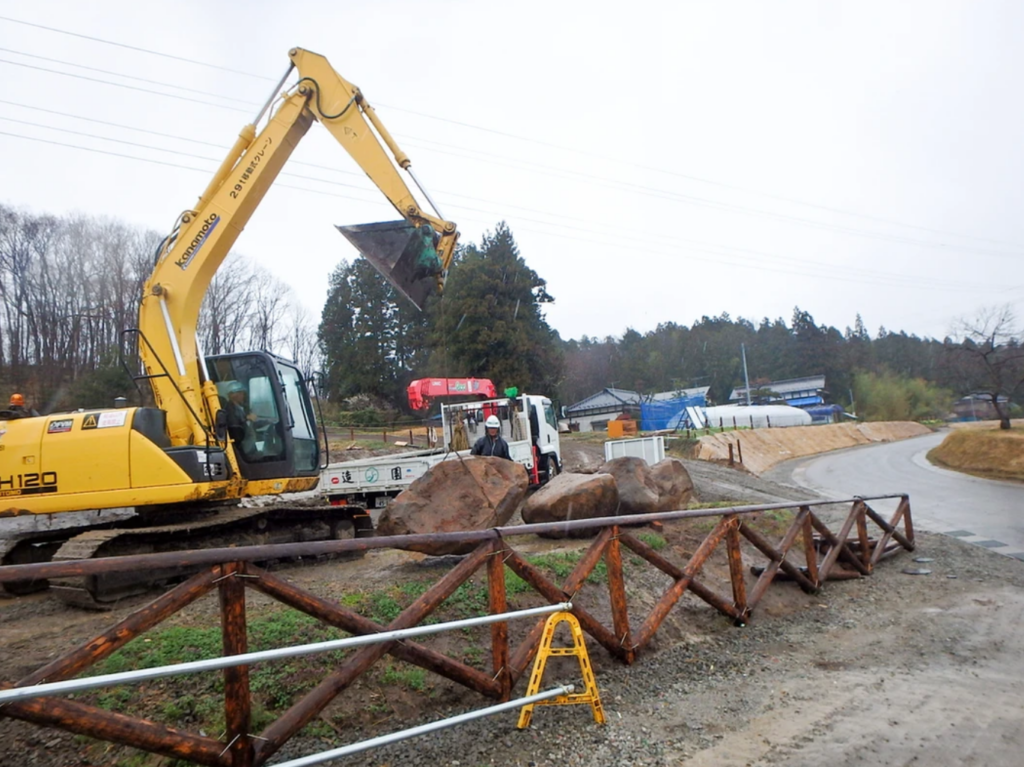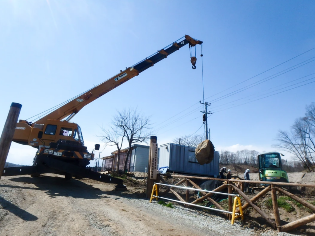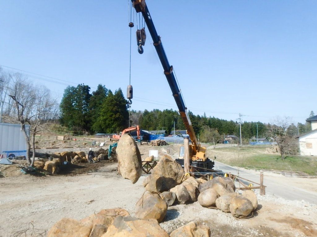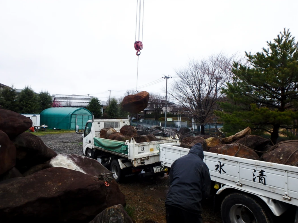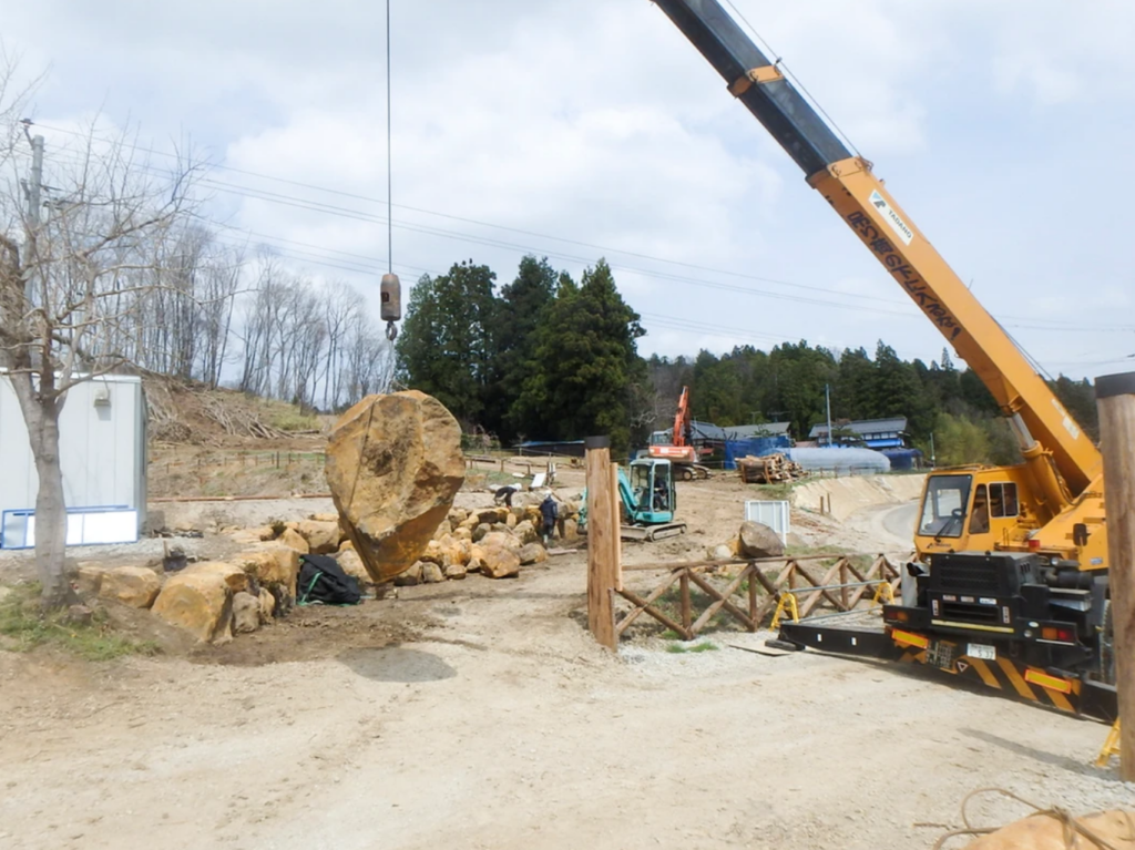 植栽もまた排水計画の際重要なポイントとなるそうで、植物が育ってからの‘根の張り方’を工夫して植栽することで、強固な地盤を作ってくれるとの事。ただ石を積む・置くだけではなく、植栽を含め様々な要素が絡み合うことで一つの空間・現場が出来上がっているのです。
