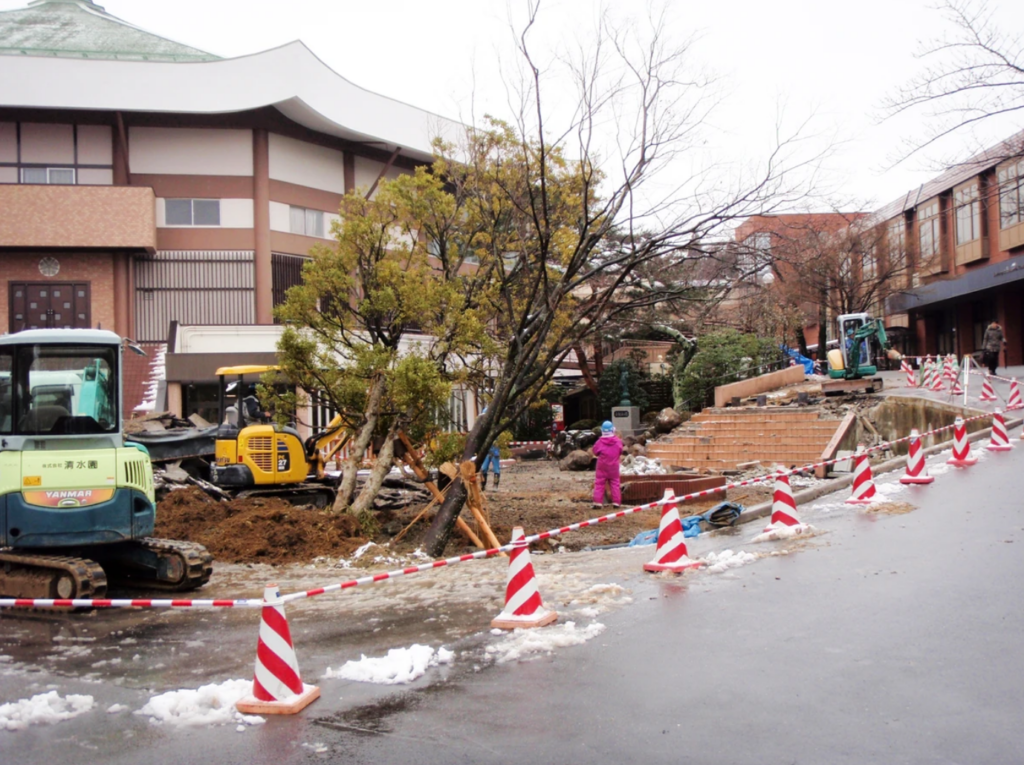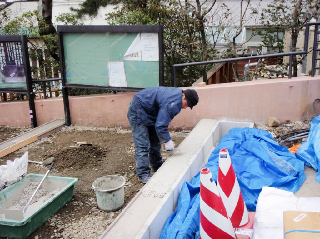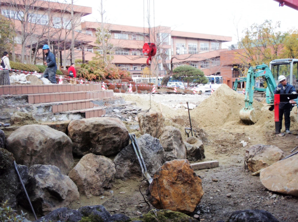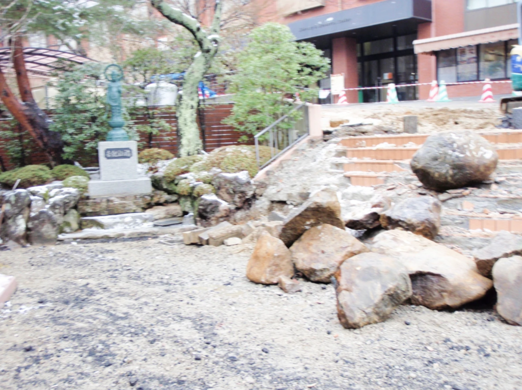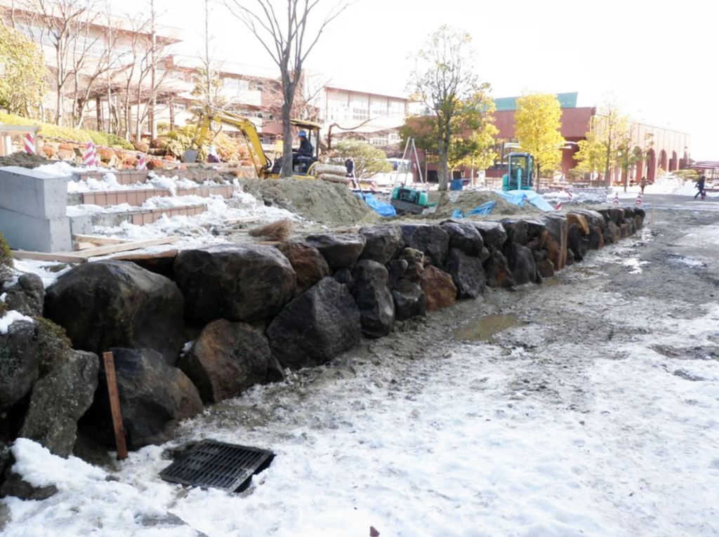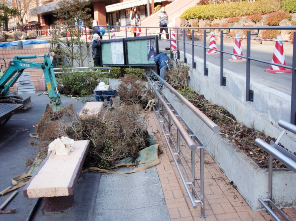 タイル張りの階段が冬に凍り危険だという事と震災でであちらこちらヒビが入ったため階段の改修工事に伴う造園工事になります。