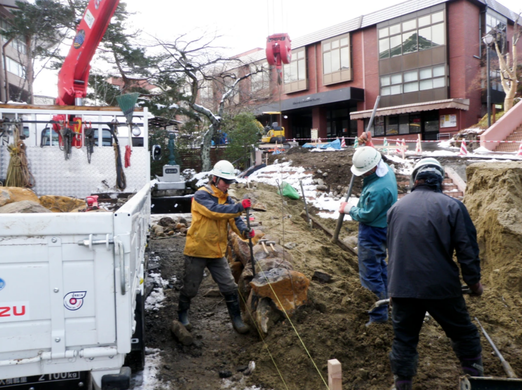 既存の石積みに繋ぎ石積みを進めていきます。また、解体工事も同時に進んでいるので、他業者との取り合いも色々あり大変です。