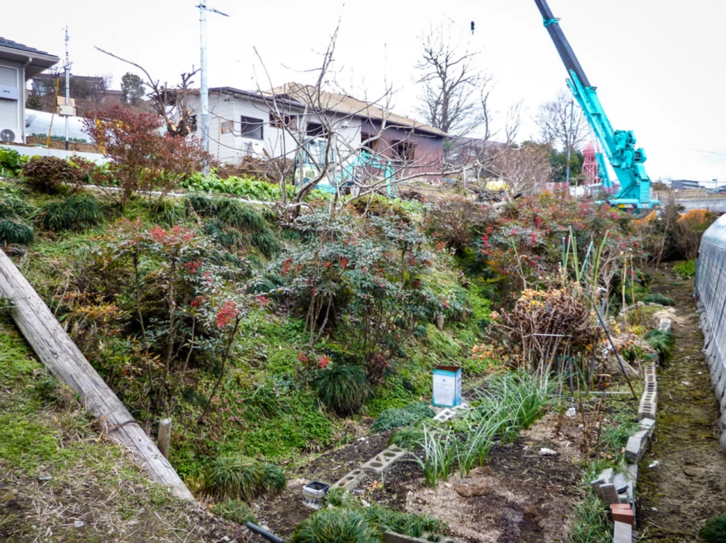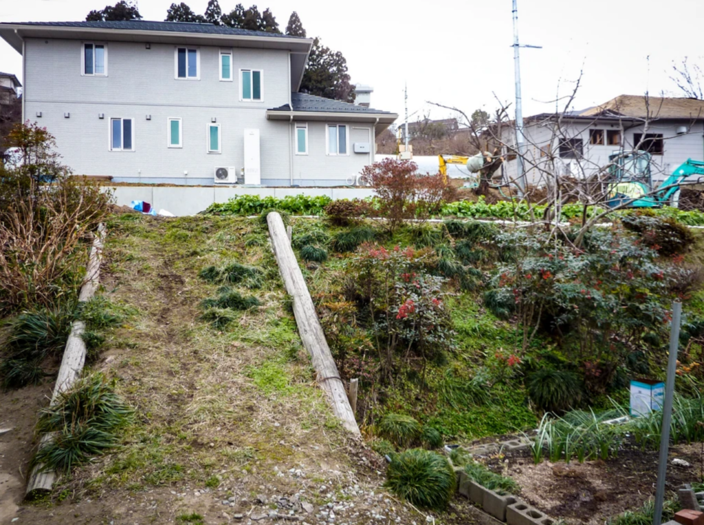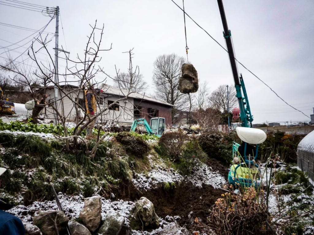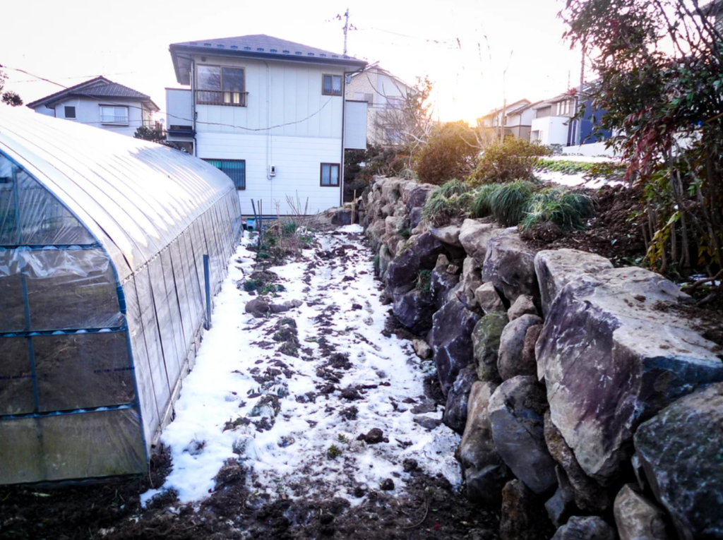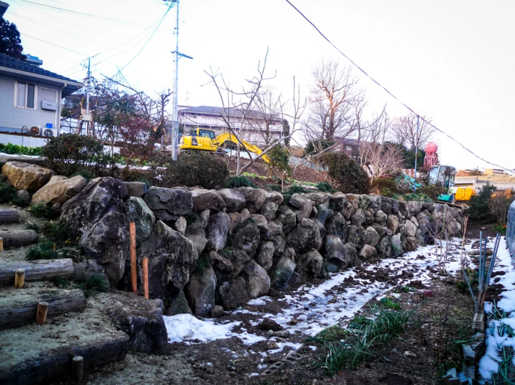 東日本大震災の翌年、代表が敷地の全面改修を思いつき10年計画・毎年1月に、少しずつ改修工事する……その取組の一つが、敷地に続く「畑の石積み」でした。この畑の石積みに使用している石は、震災後の庭の解体現場から出た庭石を使用しています。