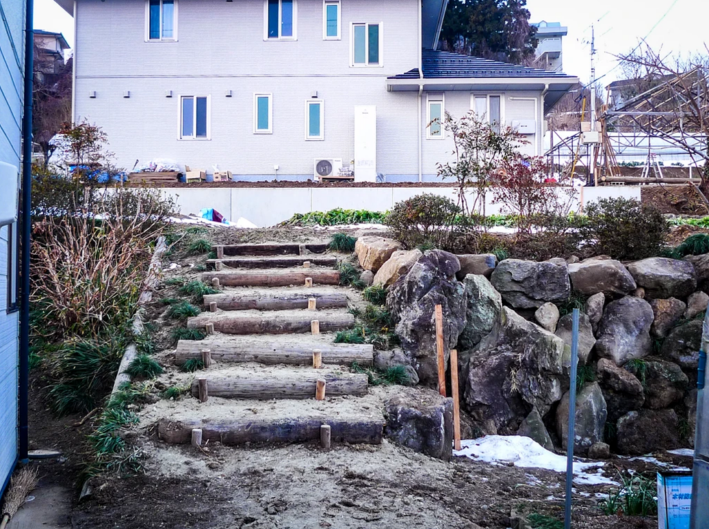 高さ約2m・長さは約20m、手前から奥へ行くにかけて低い石積みになっていきます。着工前は法面に木が植えられている状態で、畑へ登る道も急で登りづらい坂になっていました。石積みと法面に植えられていた樹木を植栽し、石積み前に土留に使用していた古電柱を階段に再利用することで、坂も登りやすく、すっきりとした印象に仕上がりました。