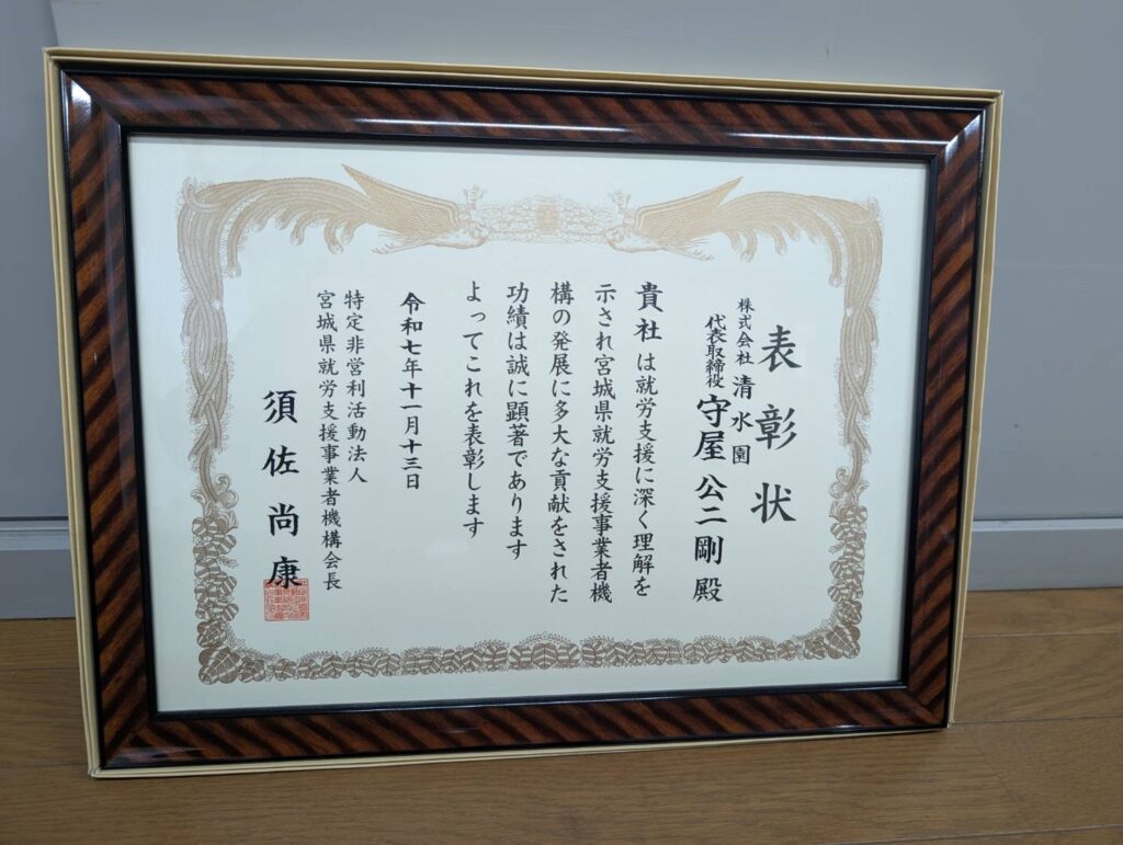 2026/3/5 宮城県就労支援事業者機構から表彰状をいただきました。 この度、宮城県就労支援事業者機構から表彰状をいただきました。 今後も就労支援に努めてまいりますので、変わらぬご指導・ご支援を賜りますようお願い申し上げます。