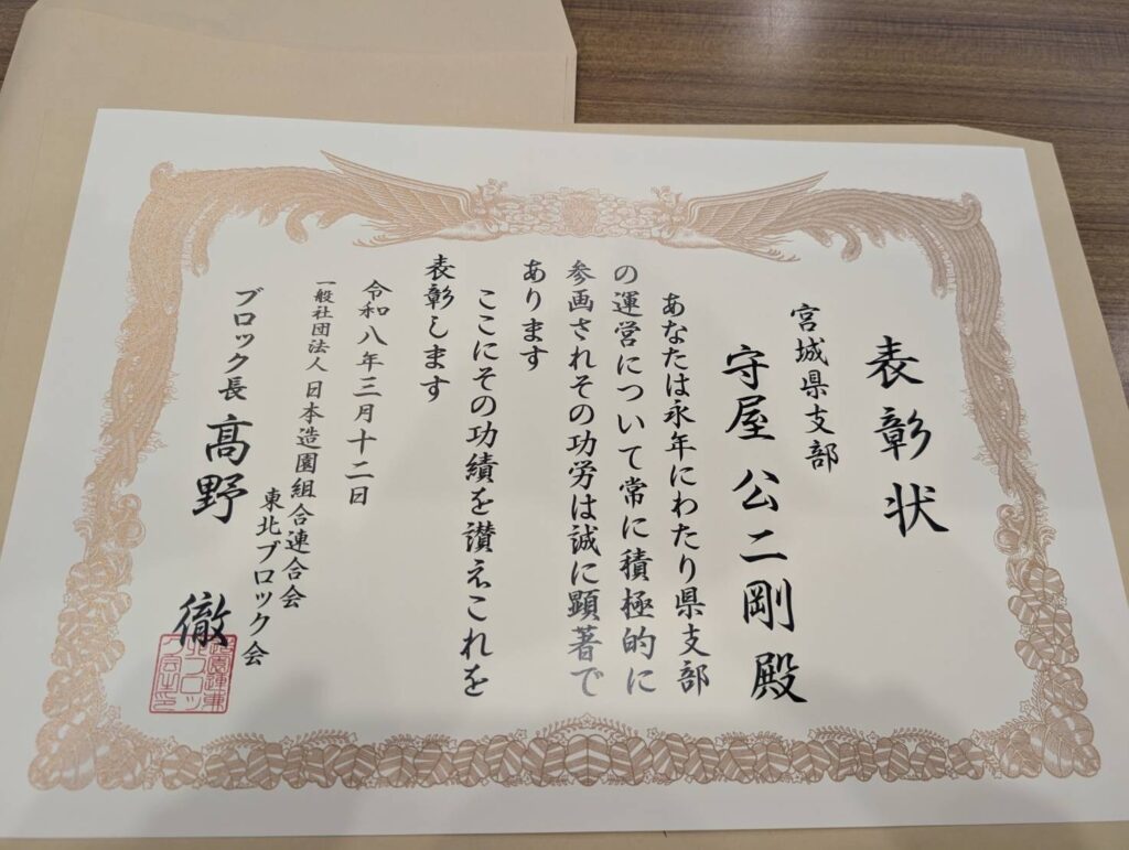 日本造園組合連合会 東北ブロック会から優良会員表彰をいただきました。