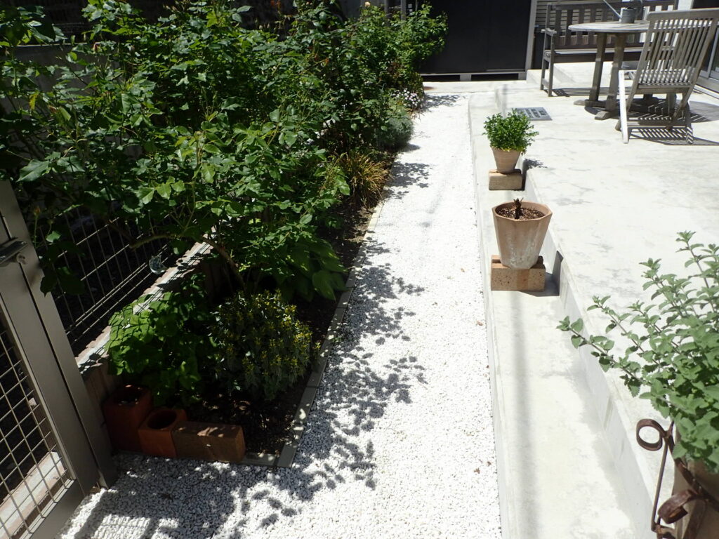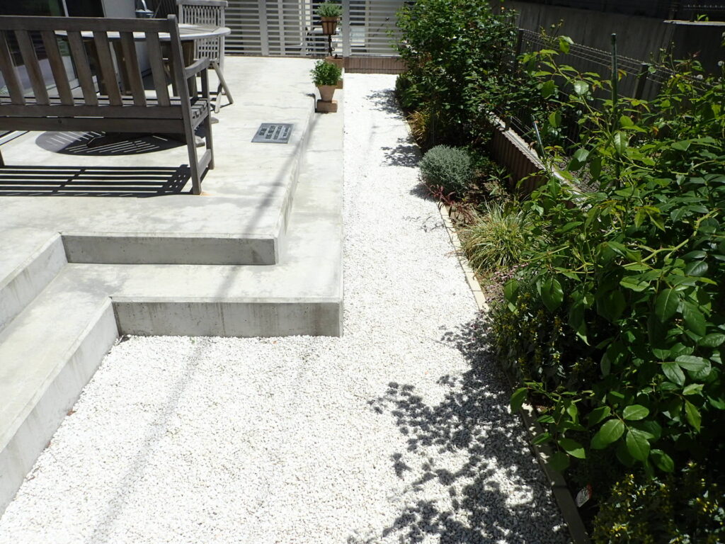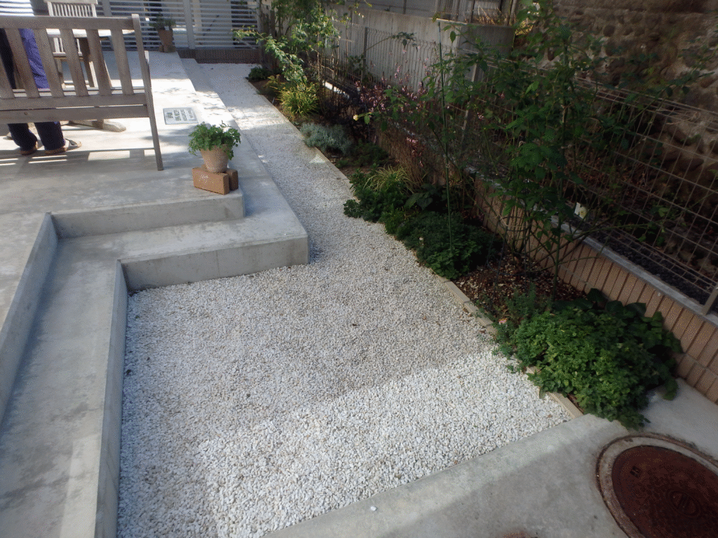 また、コンクリートが多く、花壇との段差があるためより狭く感じられるお庭の構造でした。そこで、花壇を上げ、一段分の階段の段差と同じ高さまで高低差を平らにするところから始まりました。そうすることで、すっきりとして、広く見せることができるそうです。