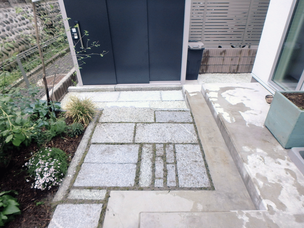 「ただ、今回のように階段等の段差を無くす場合、桝やマンホール等の埋めてしまうと困るものが出てくるので、現状復帰できるようにコンクリートは使わずに何かあった場合に外せるように固定しています。どこに桝があるのかを把握していれば、あとはその部分の石を外せばよいだけです。コンクリートをうつのも良いですが、石の方が色の変化も楽しめ、高級感も増します。」