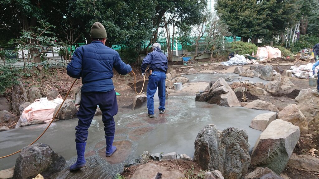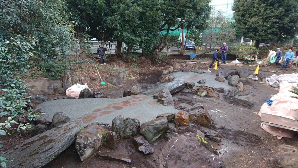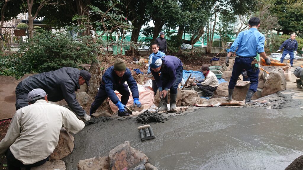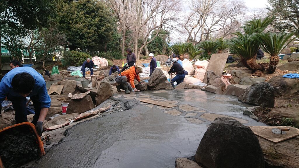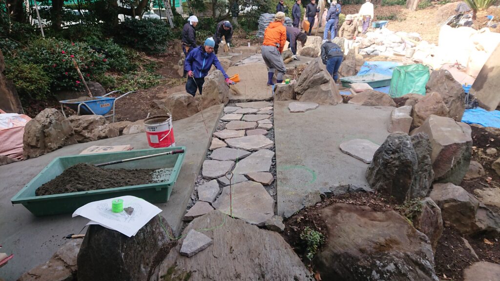 そして洗い出し前のセメントの塗り付け作業が終わったので、乾かしている間に次回講習会に向けて、チェーンブロックを使⽤し滝⽯の組み換え及び提出課題レポートについての説明を受けました。