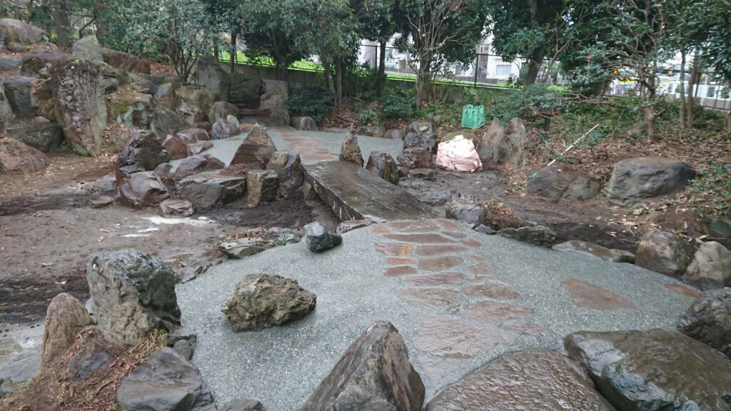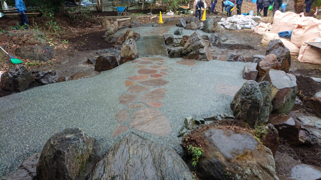 今回のポイントとしては、写真で分かるように、張り⽯の⼿前と奥に⼤きな⽯が配置され、右側に⽯が2つふられていますが、これが最終的に洗い出しの天板になるので、⾼さを間違えると洗い出しで⽯が埋まってしまいます。洗い出しというのは、砂利とセメントを混ぜて流し込み、セメントが乾く前に表⾯を洗い流し、砂利の頭部分のみを露出させる⽅法です。通常は、遅延材を⽤いて翌⽇に洗うのですが、今回の講習では⽔の分量を限りなく低くして当⽇に洗う⼯法でした。元は、このやり⽅が⼀般的でしたが、どうしてもコンクリートの強度、仕上がりや施⼯性を考えると遅延材を⽤いたやり⽅が現在では⼀般的になっています。