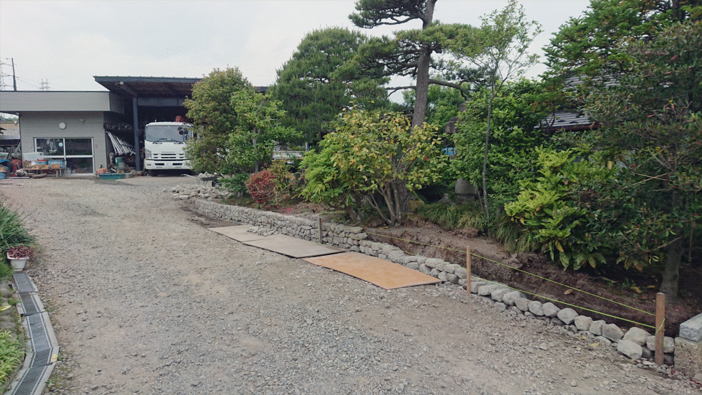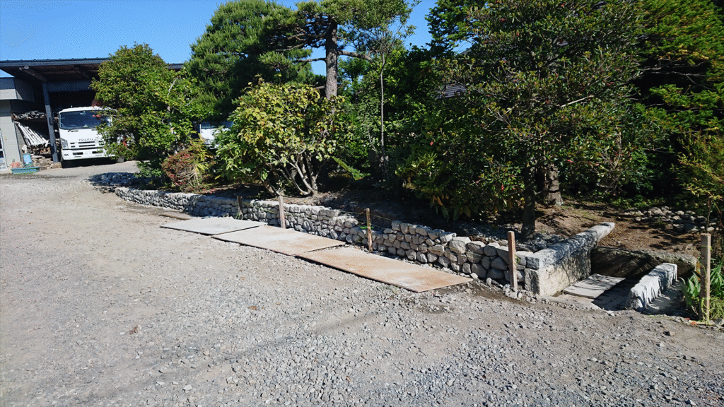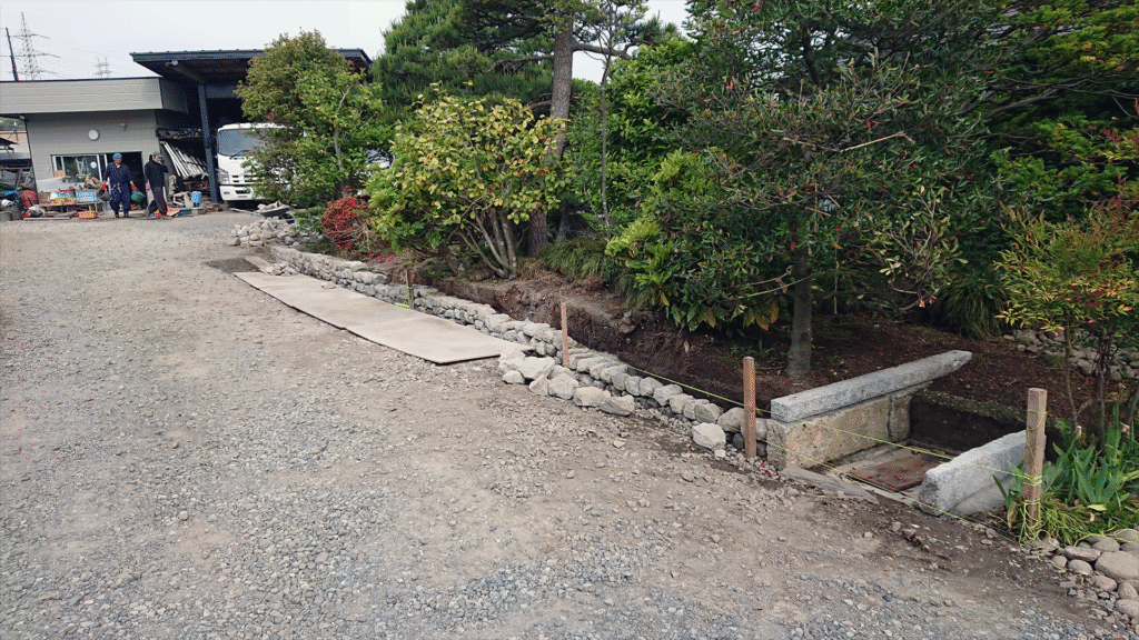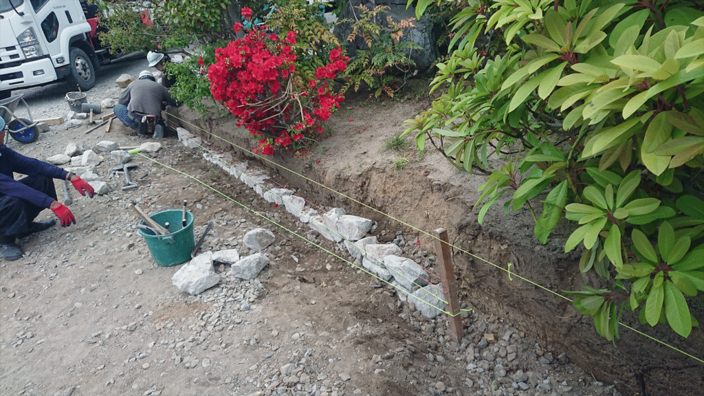 また、水糸を張る杭は、途中でずらしてしまうと全てがずれてしまうため、はじめに杭を立てた場所のまま、石積みが終わるまで残しておくことを想定して進めていく必要があります。石積みの際に杭が邪魔になることもあるので、そこも想定した上で作業を行なっています。石積みの距離的には大した長さではないですが、結構な時間と労力がかかりました。
