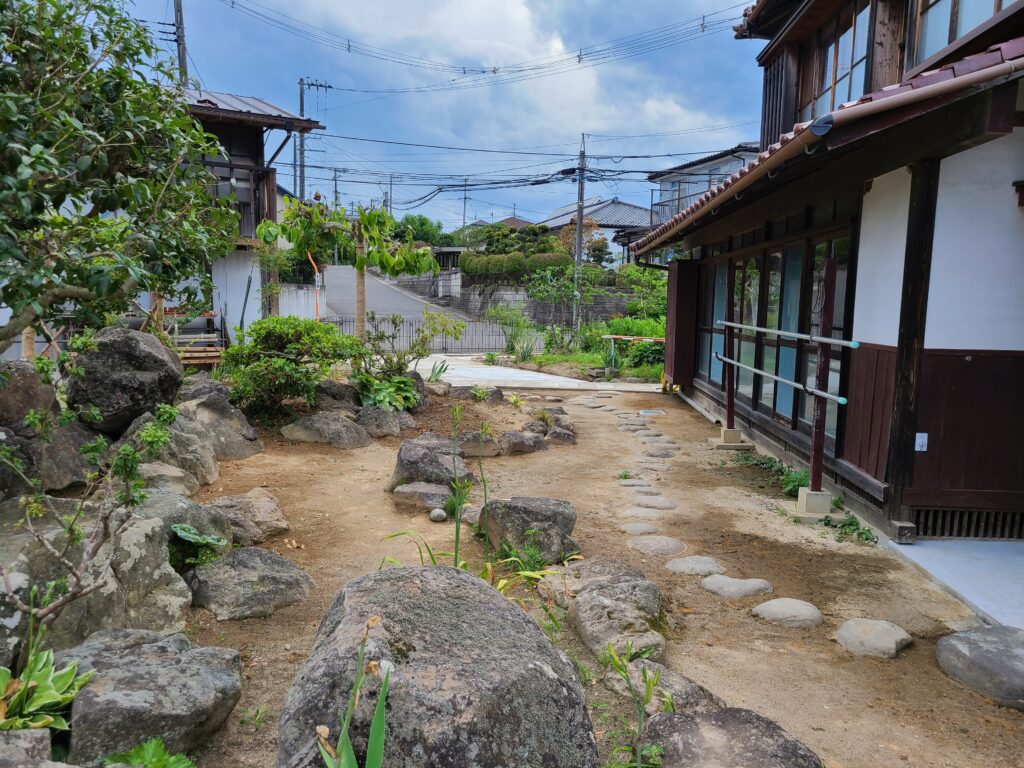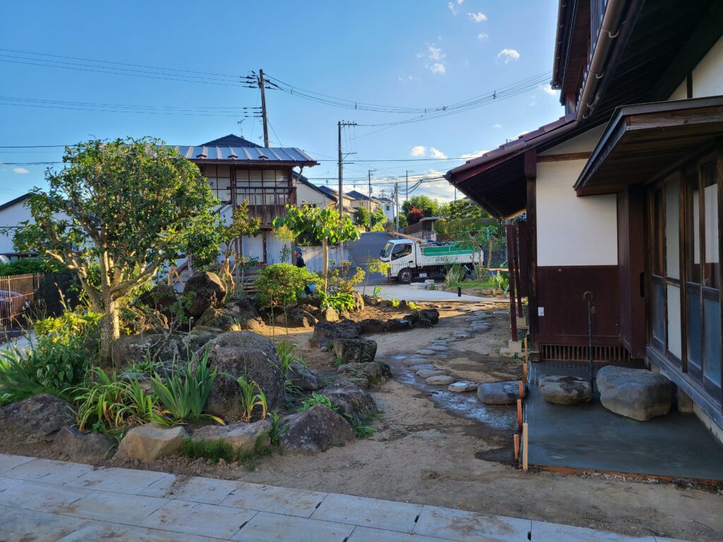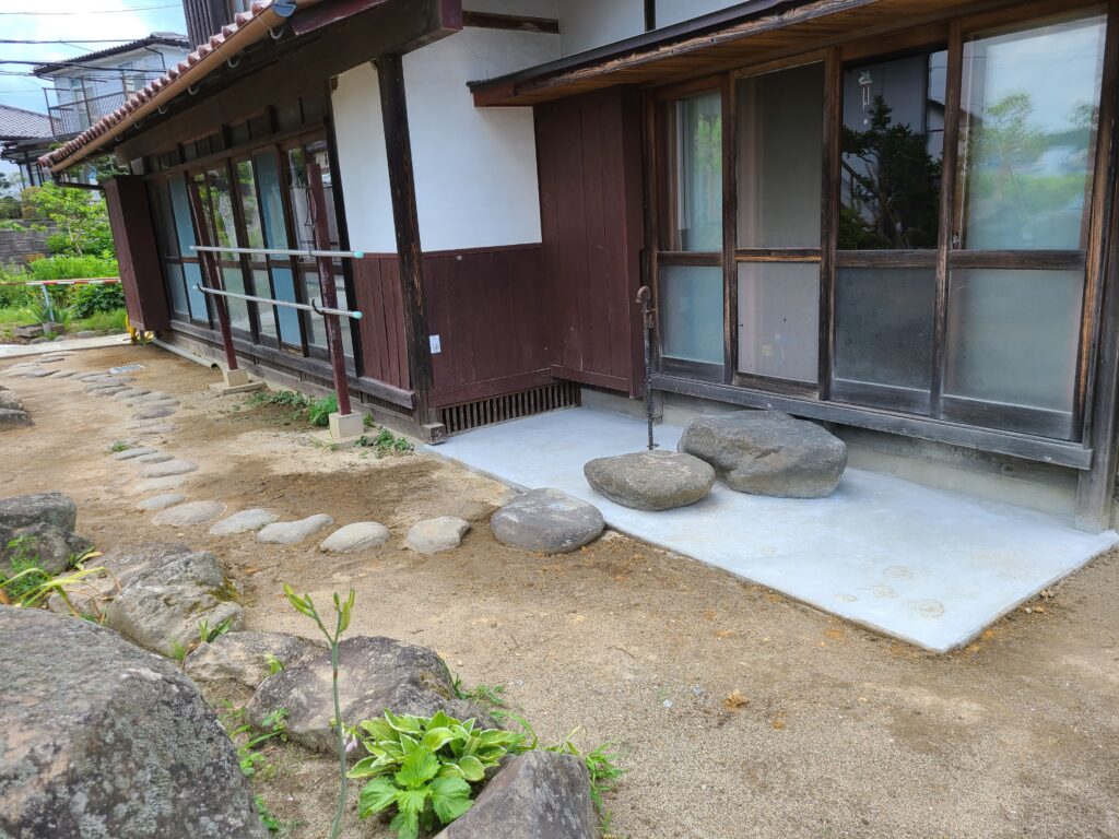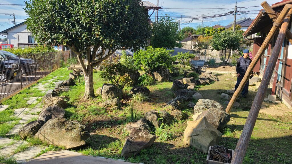 石組の際の石の位置の決め方は、お家から庭を見たときの視点で考えて設計します。施主様が普段どこにいるのか、よく座っている場所から見た時に庭がどう見えるか等を考えて石を並べていきます。また、今回は元々置いてある石は全て使い切ってほしいとのご要望でしたので、全て使い切れるように配置しました。