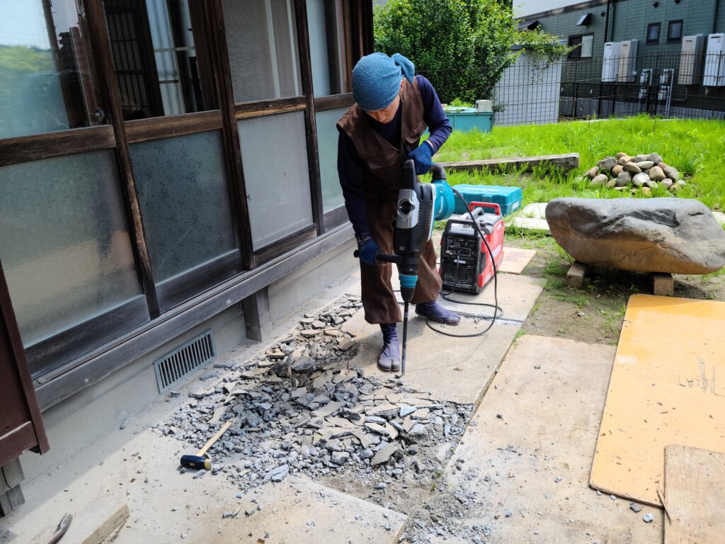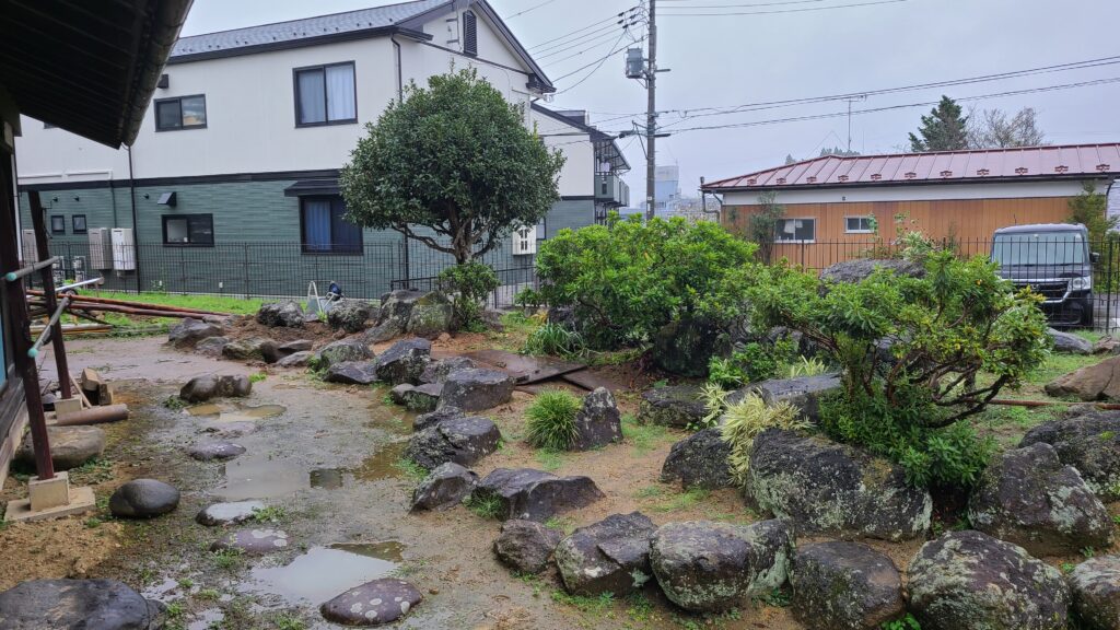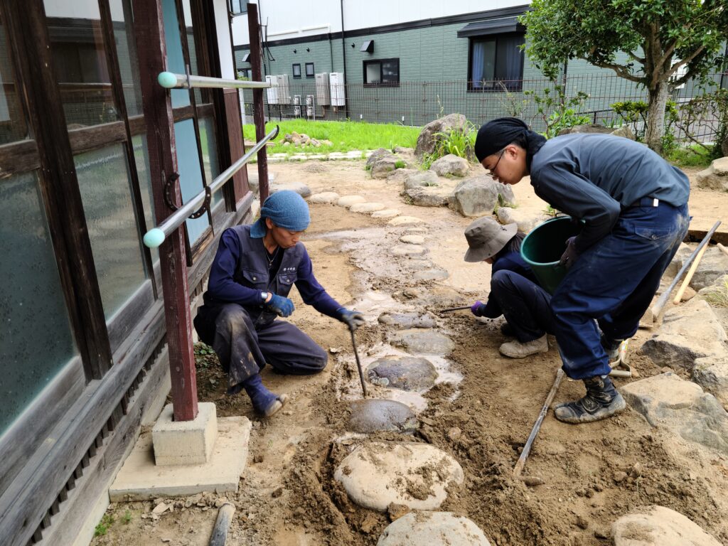 庭というのは、更地に作るのは簡単ですが、すでに置かれた石を解体しながら並べ直すのは非常に大変で地道な作業になり、時間もかかってしまいます。また、当初は石を適当に置いてあっただけの状態で、飛石も何度も置いては外しを繰り返していたので、穴だらけの状態でした。