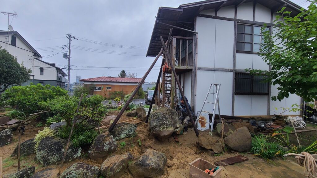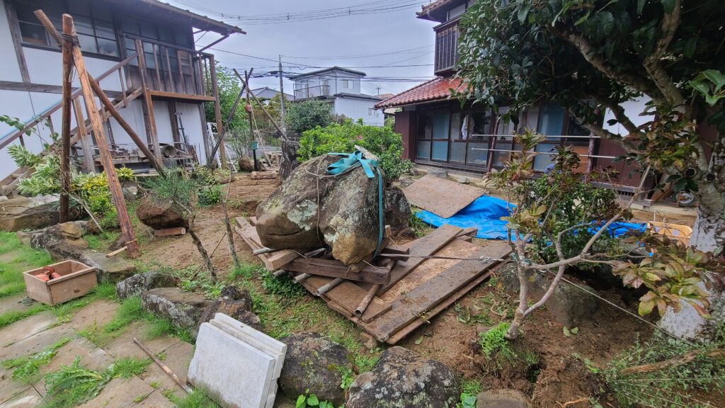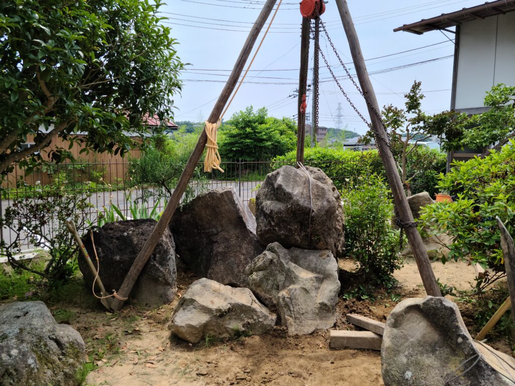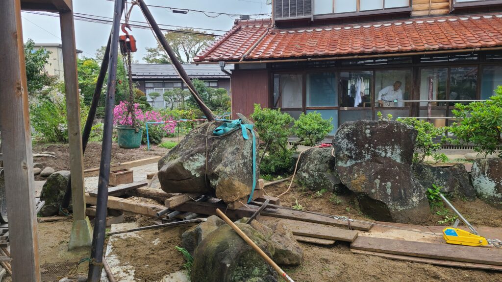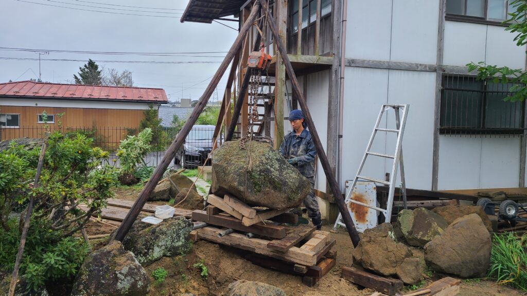 今回の現場であるI邸には駐車場がなく、I邸の隣にあった他人所有の駐車場を借りることができれば大きなクレーンで石を動かして楽に作業を進めることができたのですが、借りることができませんでした。そこで、人力で全ての石を動かすしかありませんでした。そこで、昔はよく使われていたチェーンブロックとコロという道具を用いて、全ての石の並べ替えを行いました。チェーンブロックとは、滑車の原理で重量物などを軽く持ち上げることができる優れもので、クレーンの入らないような狭い庭で石などの重量物を吊り上げたり運んだり設置したりする際によく使います。地面に足場板を敷き、その上に丸太や単管パイプ等のコロを並べ、コロの上にソリを載せて、その上に石や木の重量物を載せて、引きながら移動させます。