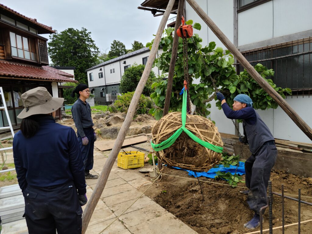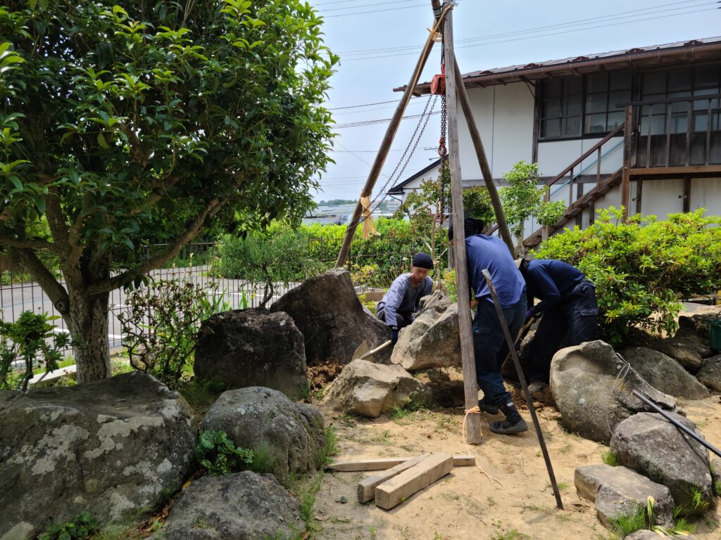 まずは、石の置き場所を作っていく必要があるので、なるべく効率的に動かせるように考えて配置しますが、ポイントになるような大きな石は庭の遠くから運んでくる必要があるので、周辺の石を一旦バラして近くに置いておき、石の通り道を作ります。写真で見る以上に、今回の現場の石は大きいので、チェーンブロックで他の石や木などにぶつからないように避けながら移動します。チェーンブロックで移動する際は、高さがあると石が落ちた際に危険なので、最小限の高さに調整して引っ張って移動します。