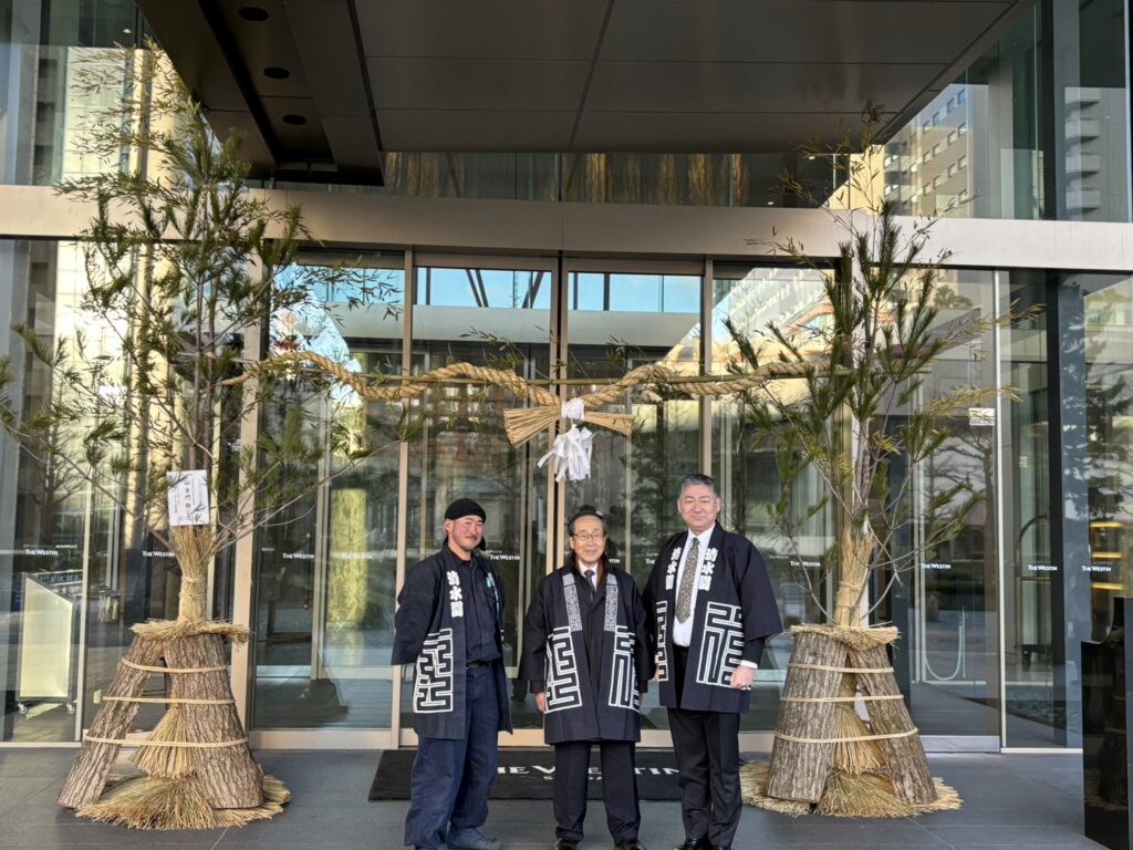「門松を制作するようになってから気づいたことがあります。清水園では昨年から半被を着るようになったのですが、みなさん半被が好きなようで、仙台うみの杜水族館の社長とウェスティンの担当者と清水園の半被を着て、また鐘崎の社長はマイ半被を着て朱入れを行いました。神授の際は通常、上着を脱ぐことが一般的ですが、半被は正式な衣装であるため脱ぐ必要がないそうです。」