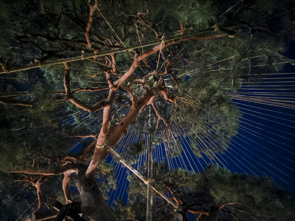 冬仕事といえば、雪吊りや冬囲いが代表的な作業です。雪吊りは、積雪の重みで木々の枝が折れないように支えるための伝統技術であり、冬囲いは植物を寒さや害虫から守るために施されます。特に、越冬できない虫たちは暖かい場所を求めてやってくるため、冬囲いの一環として「コモ巻き」を行います。用途としてはコモ巻きだけでも十分ですが、少しでも美しく仕上げるために、見た目にもこだわっています。