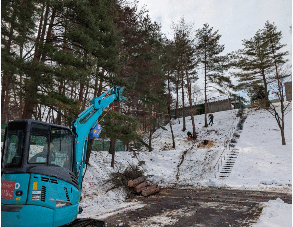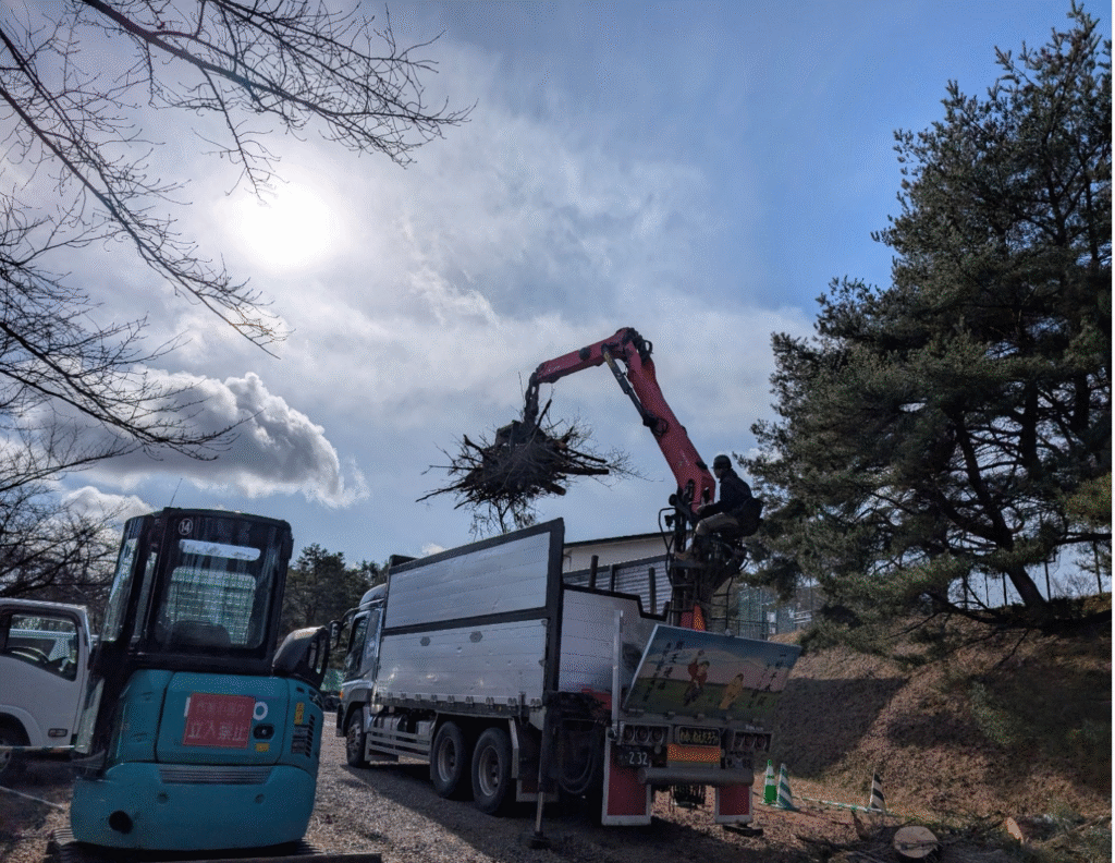 コンマ1(3トン級の重機)を使って、人の力では運べない大きな木をウィンチで引っ張り倒したり、機械の近くまで引っ張って、ダンプカーに積み込みもできます。