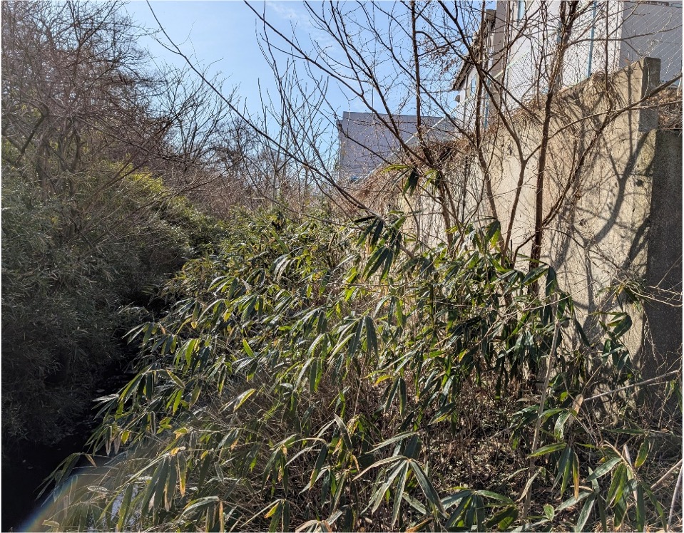 川沿いという特殊な立地条件に加え、フェンスやブロック塀が立ち並んで囲まれているため、作業スペースは非常に限られています。草をやみくもに刈ればいいというわけではなく、刈り取った草木を効率よく運び出す方法や、安全に作業を進めるための手順も慎重に考える必要がありました。