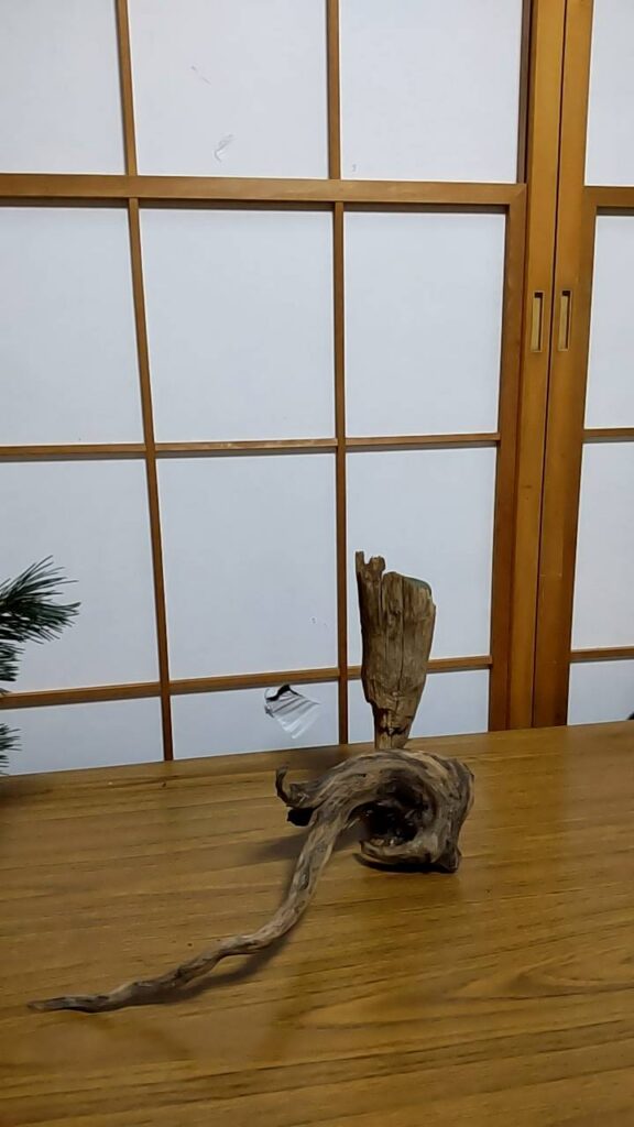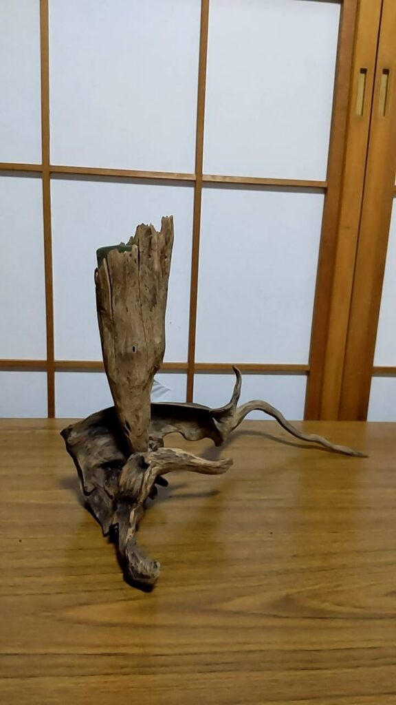 その後、先生が突然亡くなり、先生の遺言のおかげで新しい先生に拾っていただき、しばらくはお稽古のみを続けていましたが、再び先生から花展のお誘いがあり、出展することになりました。今回は流木を使った花器に「自由に生けてよい」とのことで、ありきたりな木の枝を使った素朴な作品を制作したところ、大きな注目を集めたそうです。多くの来場者が興味深そうに写真を撮っていたとのことでした。