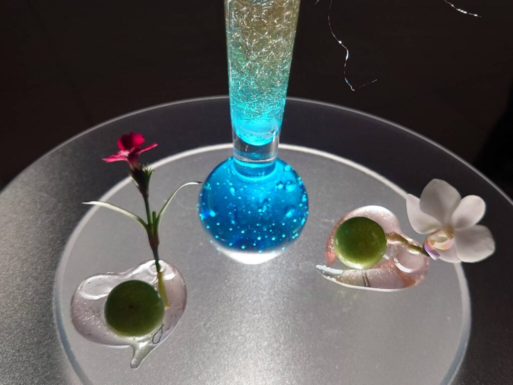 今回は、ガラスのカクテルグラスに作品を生け、下からライトアップする展示方法での出展となりました。代表は、お花そのものよりも「光の透過率」にこだわり、会場で作品づくりに約3時間を費やしました。サブの作品にハートモチーフを取り入れた、可愛らしさのある作品となり、来場者がこぞって写真を撮っていたそうです。