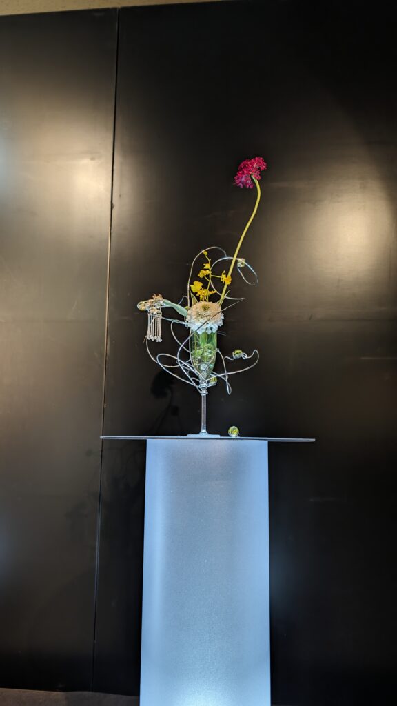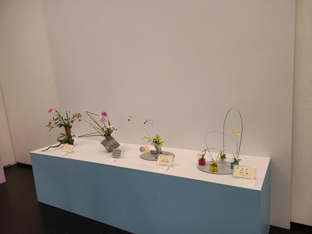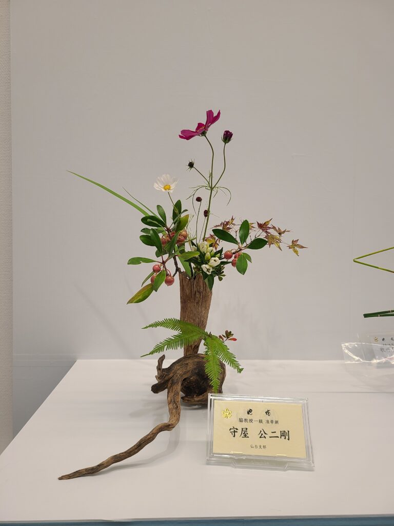はじめての花展当日は、先生の付き添いがない中での出展となりましたが、代表は堂々と、らしさのにじむ所作で作品を仕上げたそうです。本来であれば「門標(いけばなの指導ができる資格の証)」を持つ者は「生花」を生けるべきとされる中、先生の指導のもと「自由花」での出展をしてしまったため、会場が少しざわついた場面もあったようです。