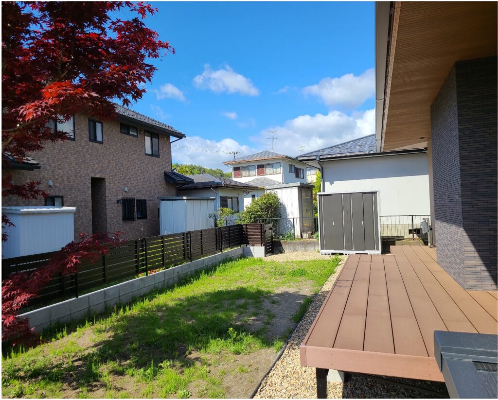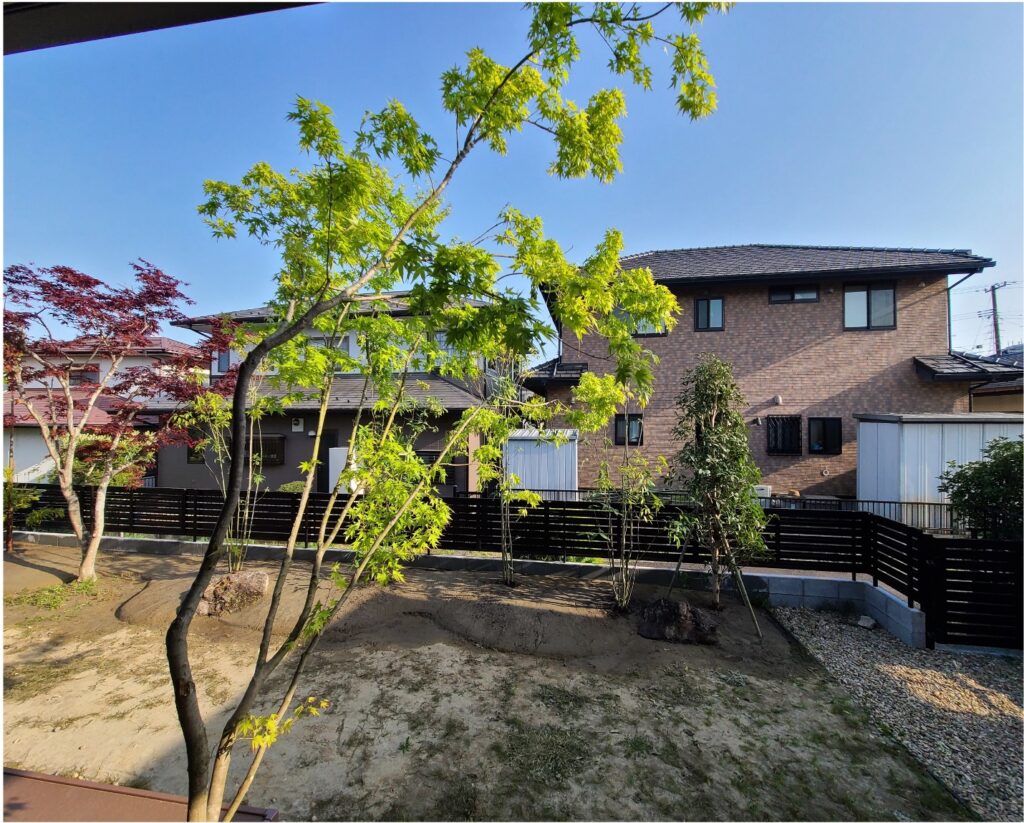 また、当初K様邸のお庭には、紅葉の木が一本あるのみで、道路や隣地からの視線を遮るものがありませんでした。そこで、将来的に目隠しとしても機能するようにと、常緑樹であるシラカシを数本植栽させていただきました。すぐに視線を遮れるわけではありませんが、時間をかけて育っていくことで、庭に緑の壁をつくってくれる存在になります。成長を楽しみにしていただけるようなお庭になればと願っております。