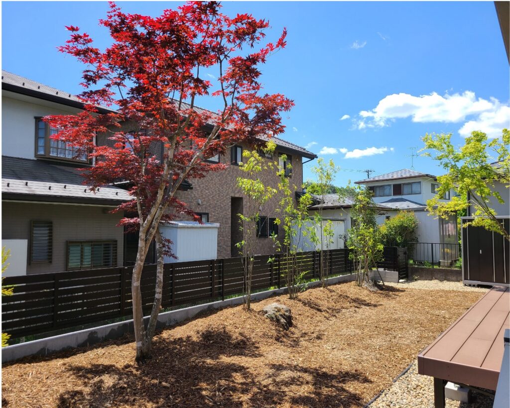 そんな中、施主様からは「お庭にちょっとした変化がほしい」とのご要望もいただきました。そこで、紅葉の横に石を配置し、築山のような盛土をして、ウッドチップで仕上げるという提案をさせていただきました。こうすることで、視覚的にも奥行きが生まれ、立体感のある庭景色を演出することができました。