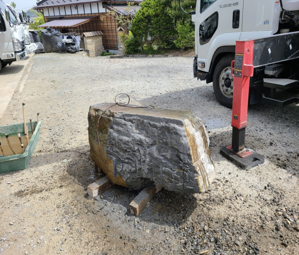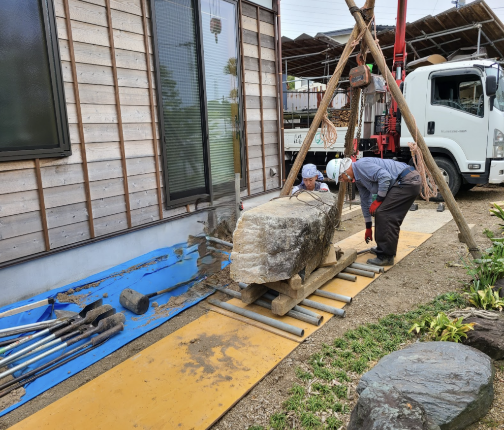 石を移動させる際にはチェーンブロックを使用しますが、建物の近くで作業する場合、持ち上げた際に石が建物側へゆれてぶつかってしまう危険があります。そのため、倒れないようロープで補強を施し、細心の注意を払って持ち上げることが重要です。