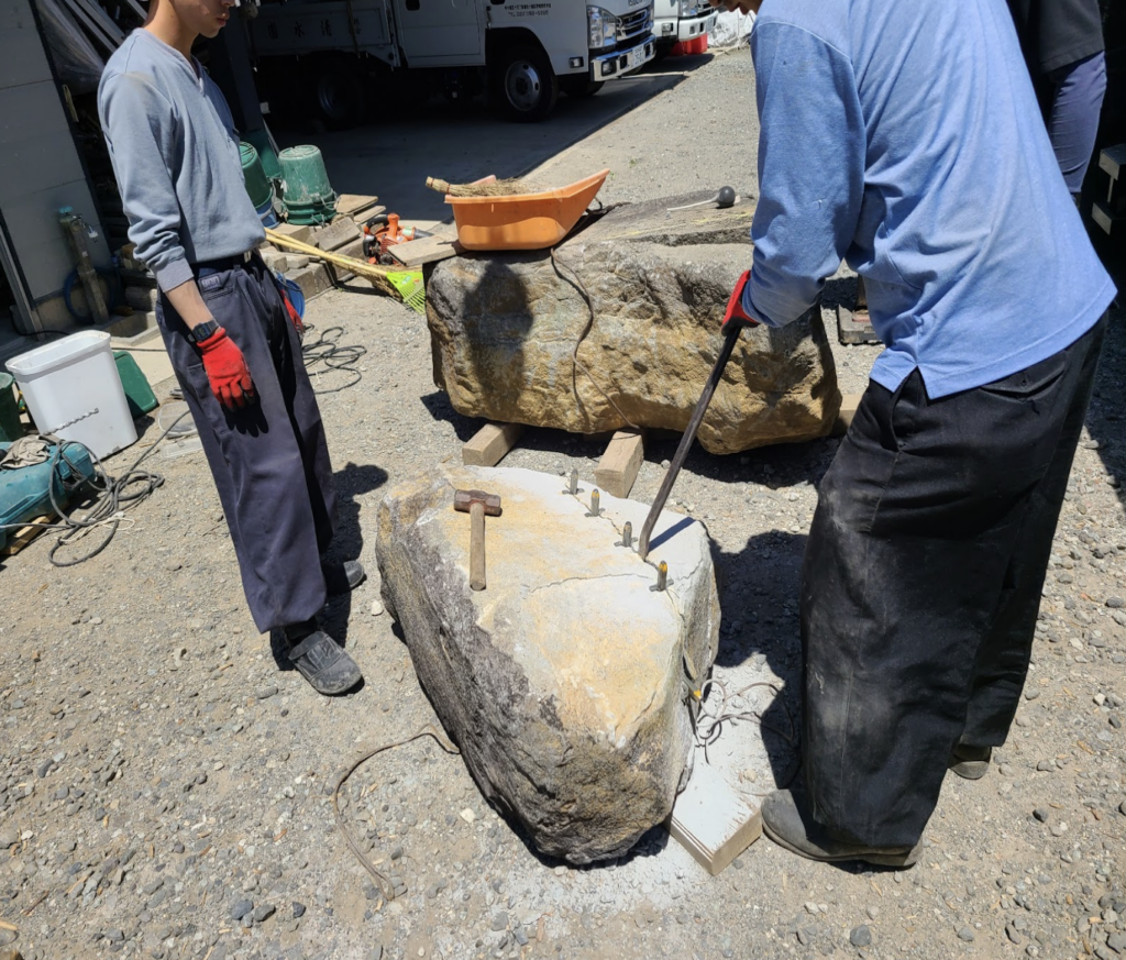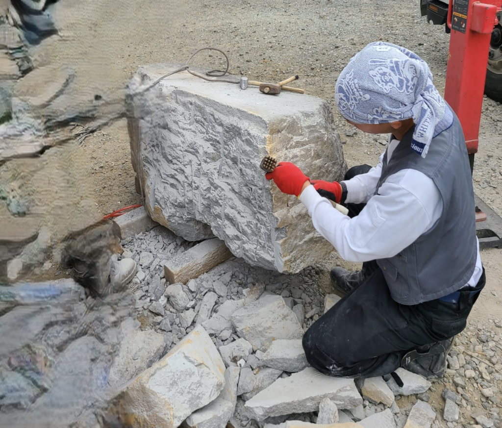 また、石をうまく割り、自然な形に仕上げていく行為は、ある意味では職人の「美意識」が大きく影響する、自己満足の世界でもあります。石と向き合いながら少しずつ整えていく作業は、仕上がりの美しさを追求したくなるものですが、実際にはお客様が気づかないレベルの細かな違いも多く存在します。例えば石と石の間のわずか5ミリの隙間などは、ほとんどの方が気に留めることはありません。