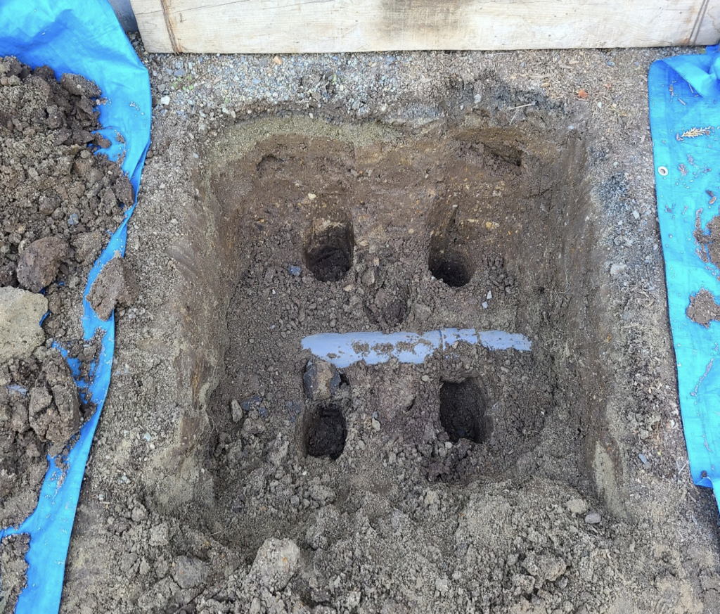 次に問題となるのが、設置場所と高さです。今回は設置予定地の下に排水管が通っていたため、石の重みで管が下がったり折れないよう、管よりも高い位置に木杭を打ち込み、菅より上の部分で石が下がらないように石を支える補強を行いました。
