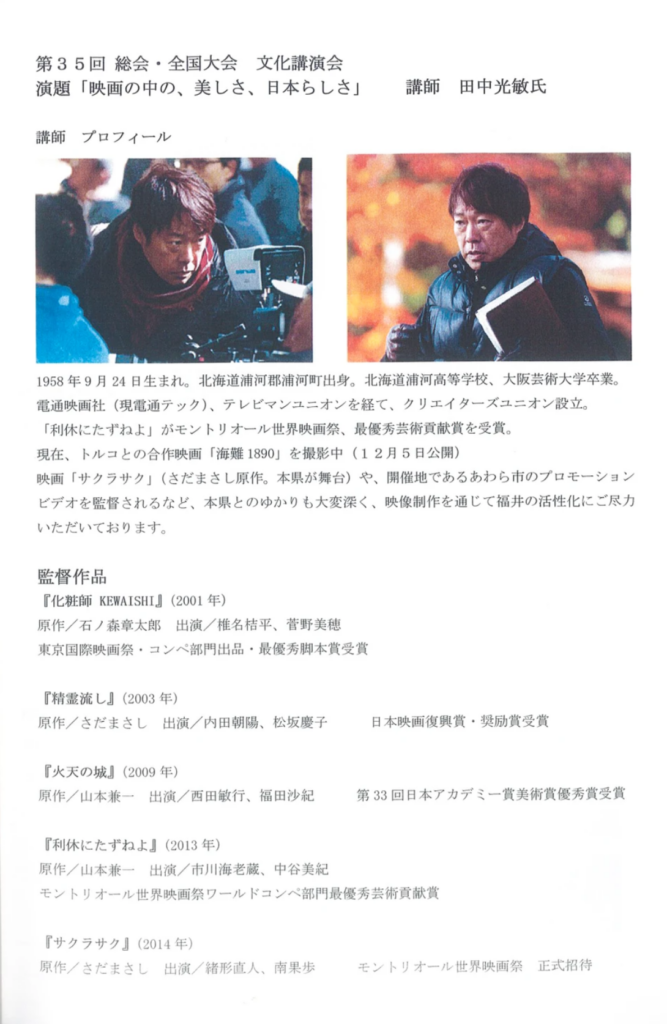 「続いて、福井県あらわ市に移動し全国大会総会に参加致しました。総会の後の基調講演の講師として登壇されたのは、映画監督の田中光俊氏。この年は田中氏の代表作『利休にたずねよ』の公開翌年で、講演会では‘映画の中の、美しさ、日本らしさ’といった演題でお話を進行されました。映画と造園…異なる領域ではございますが、田中氏曰く「映画の作り方と庭の作り方は通じるところがあるかもしれない、通じるところがあれば参考にしてほしい。」との事でした。」
