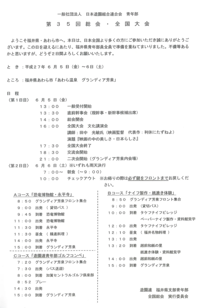 本日お話しして参りますのは「第35回福井青年部全国大会」。全国から造園家の皆様が一堂に福井県へ集結致します。