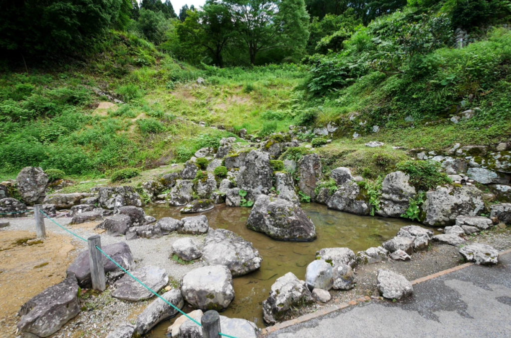 「その後、一条谷朝倉氏遺跡を訪れました。こちらは300年近く田んぼに埋まっていたところ、庭として残っていたものを発掘・調査されたという貴重な遺跡です。発掘から20年近く経っていますが、造園の雑誌『庭』にも2〜3回掲載される程…歴史的にも貴重な場所です。池は当時コンクリートもございませんから、粘土を突き固めて作ったものだと思われます。雨が降らないと池も干上がってしまいますから、雨が降って初めて池のある状態を見る事が叶います。また、お庭には4m30cm程の立派な立石もございました。おそらく15〜20トンはあるかと…それを重機もない当時、引っ張ってきて庭に立てるという凄さは想像を絶します。」