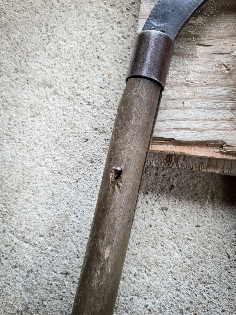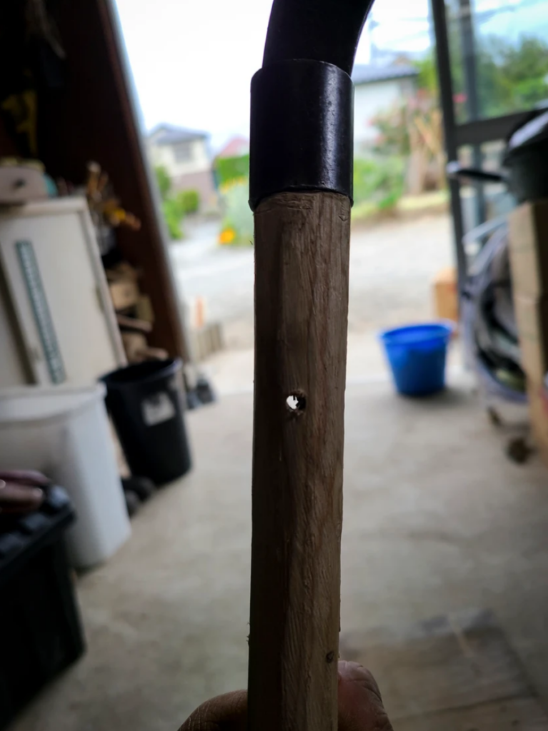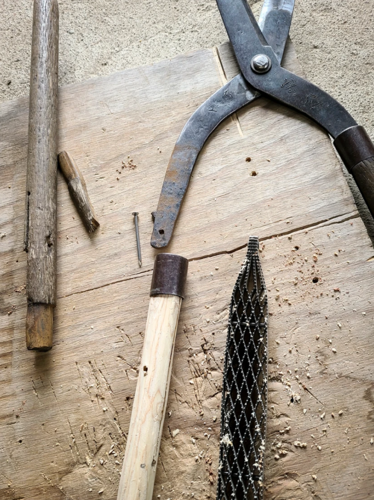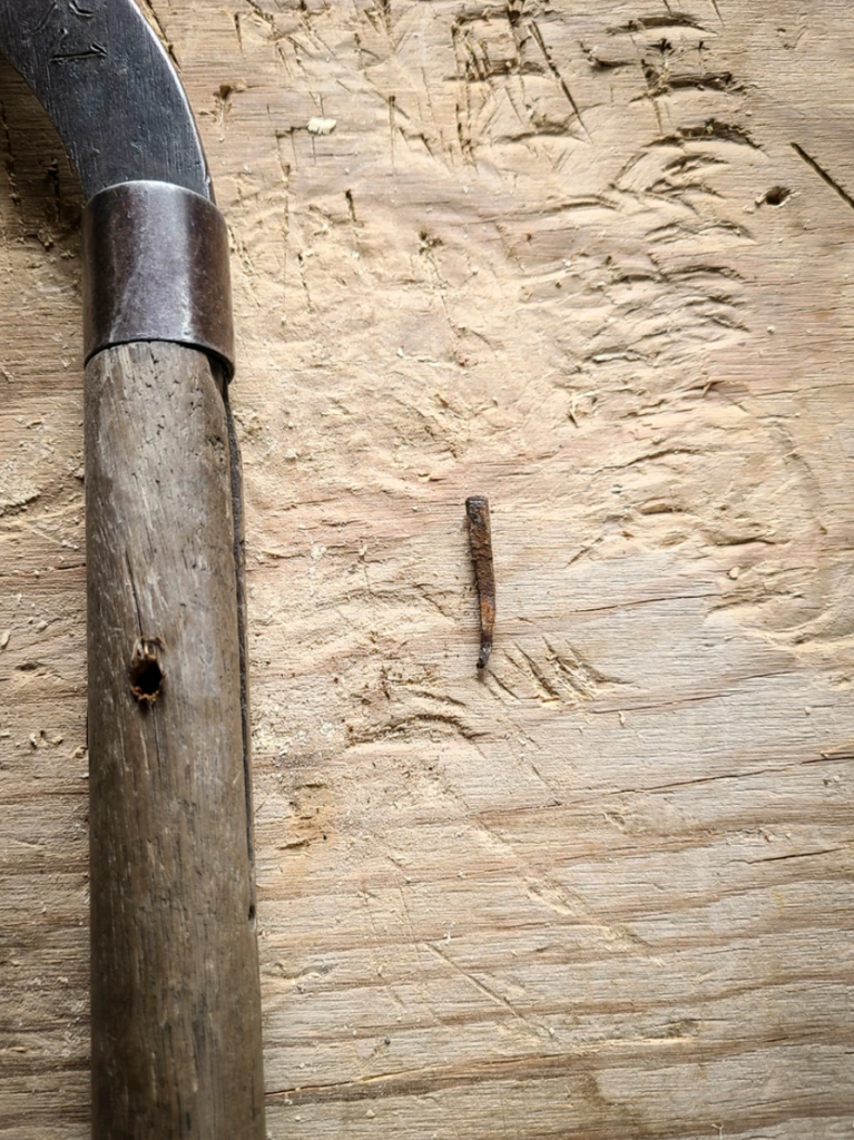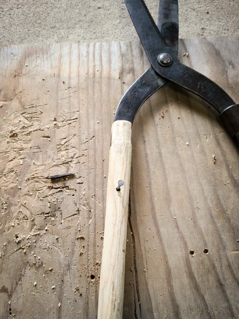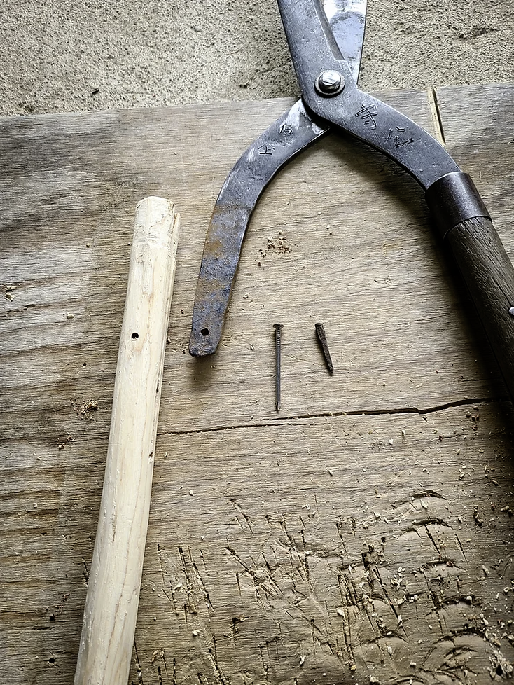 「細い木を割らないように切るというのがまた、緊張感を伴いますね。その後古い柄を抜くために釘を抜くのですが、釘も鍛冶屋さんお手製のものですので打ち直し再利用していきます。釘穴までの距離を測り正確な位置に穴を開け、仮止めをし、問題なければ次に金輪がはまるかどうかを確認し、はまれば穴の場所まで打ち込んでいきます。」