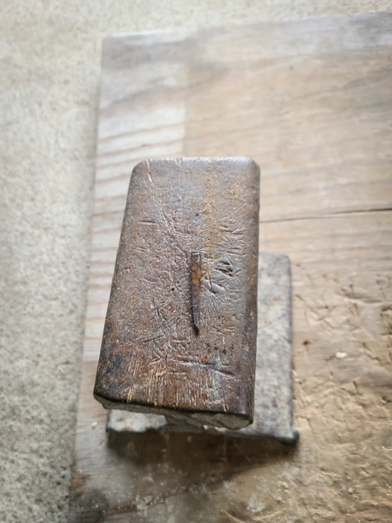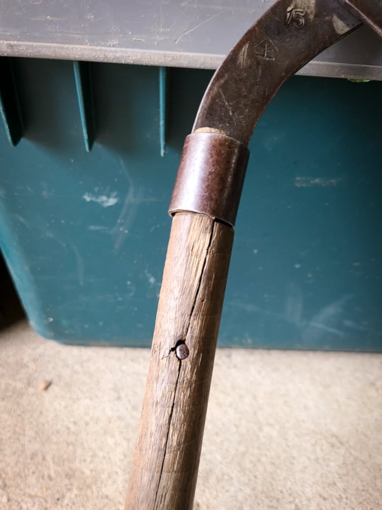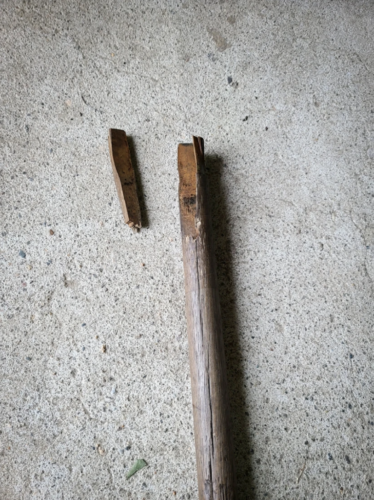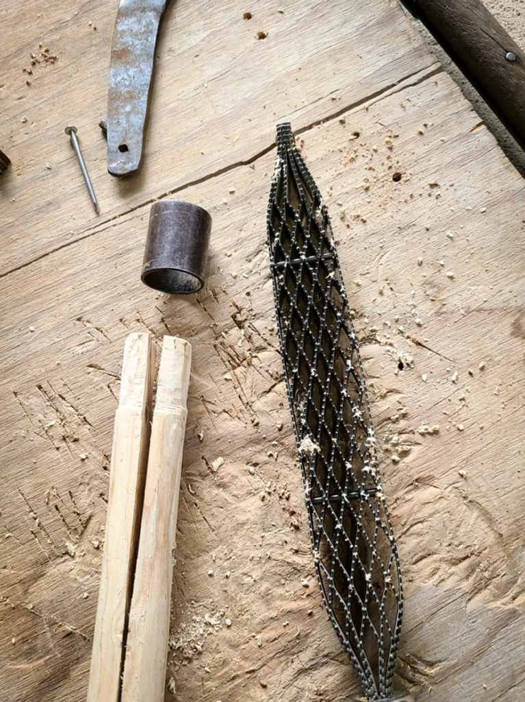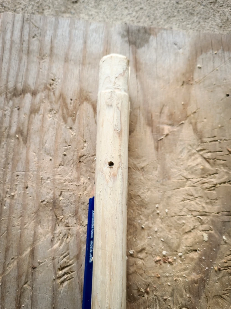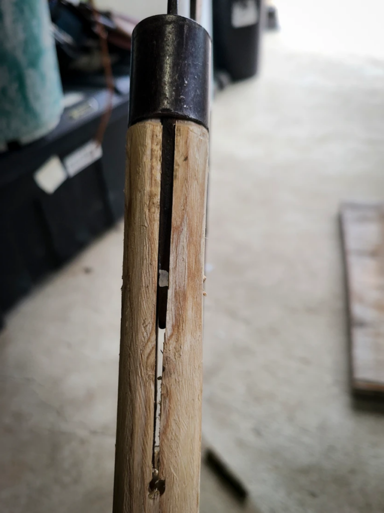 「細い木を割らないように切るというのがまた、緊張感を伴いますね。その後古い柄を抜くために釘を抜くのですが、釘も鍛冶屋さんお手製のものですので打ち直し再利用していきます。釘穴までの距離を測り正確な位置に穴を開け、仮止めをし、問題なければ次に金輪がはまるかどうかを確認し、はまれば穴の場所まで打ち込んでいきます。」
